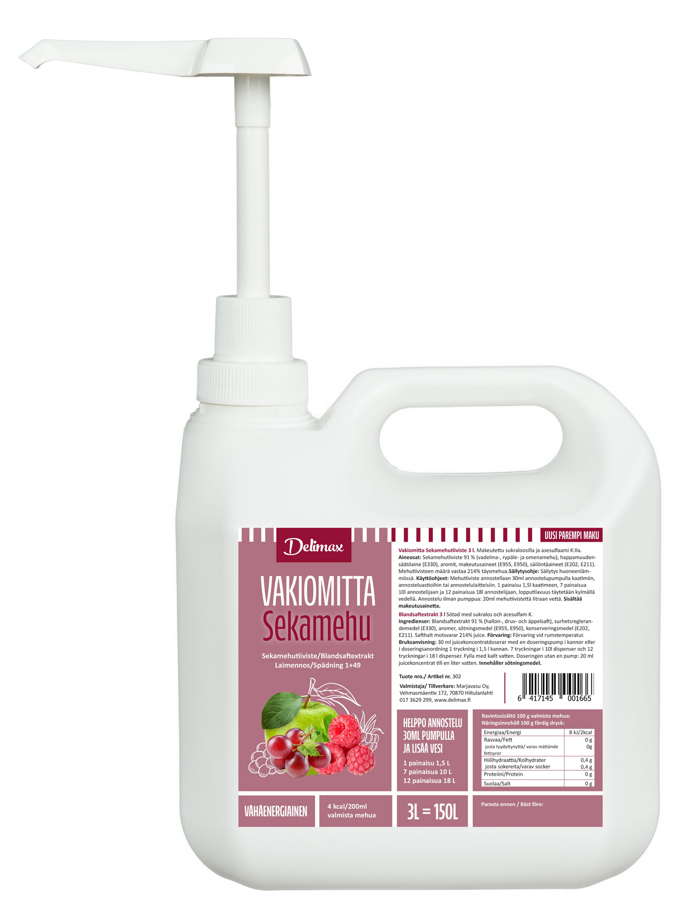 Sokeroimaton, huoneenlämmössä säilyvä sekamehutiiviste, sisältää makeutusaineita. Todella riittoisa, annostelupumpulla helppo annostella.
