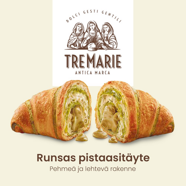 Herkullisessa pistaasicroissantissa on runsaasti aitoa pistaasimassaa. Sen rakenne on pehmeä ja lehtevä. Täydellinen croissant kruunaamaan kahvihetken tai nautittavaksi sellaisenaan makeana välipalana.