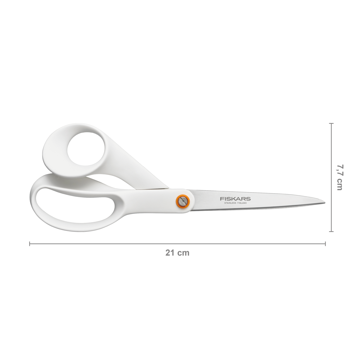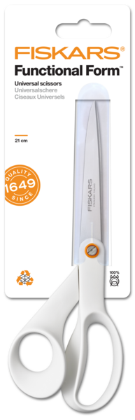 Fiskars Functional Form yleissakset 21 cm kaikenlaiseen leikkaamiseen kotona, koulussa ja toimistossa. Saksien terät ovat korkealaatuista ruotsalaista ruostumatonta terästä. Terien hionta takaa tarkan leikkaustuloksen. Konepesun kestävät. Väri valkoinen.