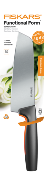 Aasialaistyylinen yleisveitsi leveällä terällä on ihanteellinen lihan, kalan ja kasvisten leikkaamiseen. Terä on valmistettu lujasta japanilaisesta ruostumattomasta teräksestä ja veitsen turvallisessa ja ergonomisessa kahvassa on syvä sormisuoja. Kaikki Fiskars Functional Form -veitset ovat konepestäviä.
