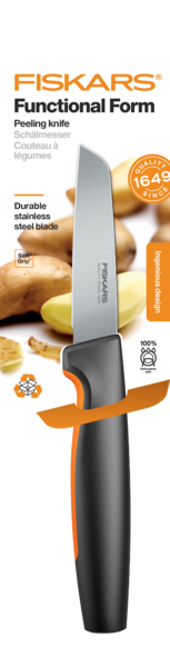 Kompakti veitsi on ihanteellinen hedelmien ja vihannesten kuorimiseen. Terä on valmistettu lujasta japanilaisesta ruostumattomasta teräksestä ja veitsen turvallisessa ja ergonomisessa kahvassa on syvä sormisuoja. Kaikki Fiskars Functional Form -veitset ovat konepestäviä.