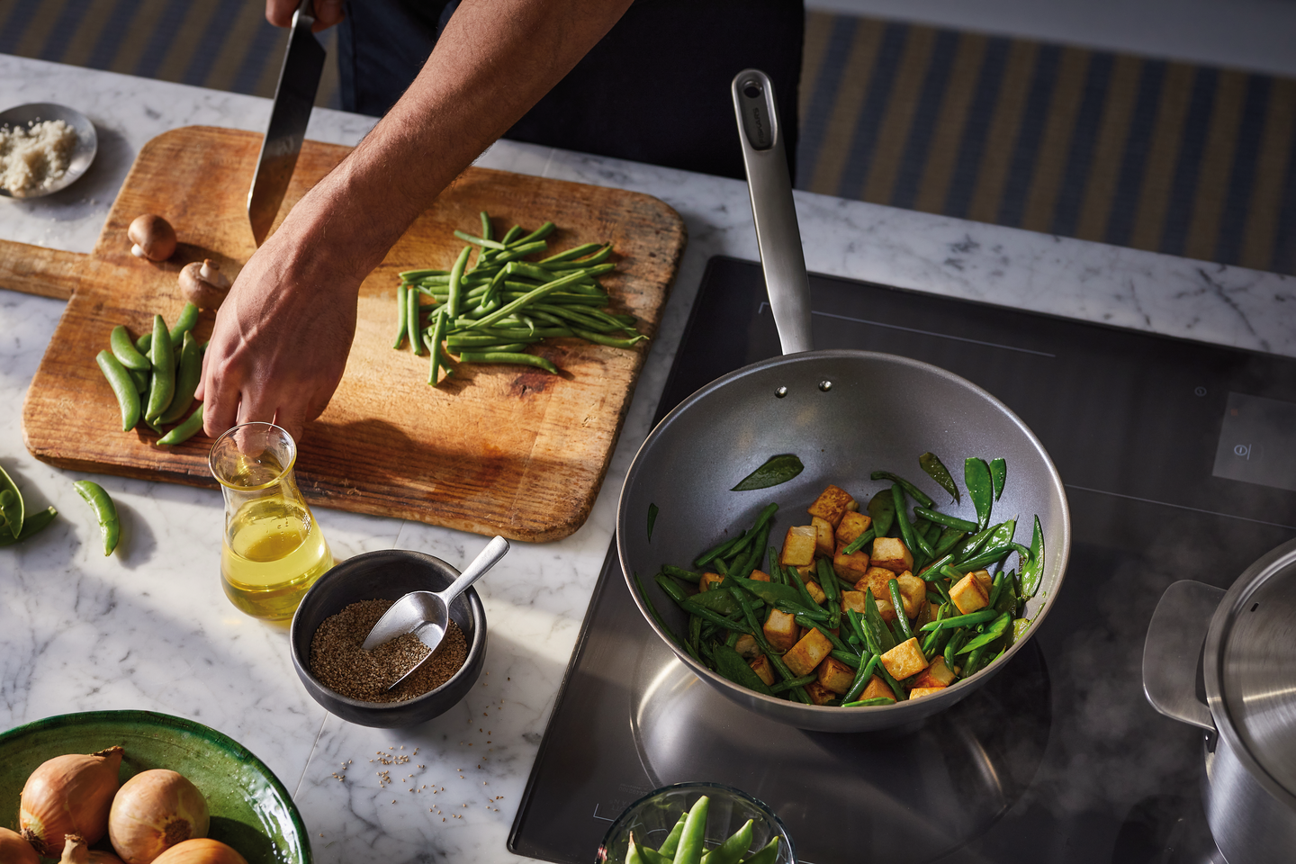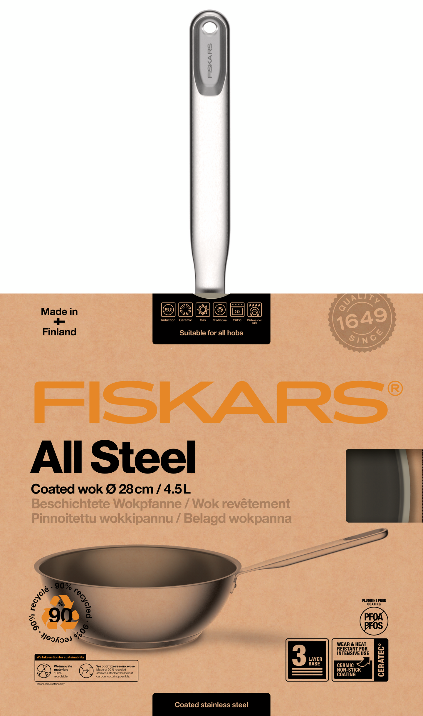 Fiskars All Steel -wokkipannu (28 cm) tarjoaa ensiluokkaisen ruoanlaittokokemuksen. Sen valmistuksessa on käytetty korkealaatuista ja kestävää, 90-prosenttisesti kierrätettyä ruostumatonta terästä tuotantojätteen määrän vähentämiseksi. Pannu kestää kovaakin käyttöä ja takaa erinomaisen paistotuloksen tarttumattoman Ceratec-pinnoitteensa ansiosta, joka ruskistaa ruoan kauniisti ja kestää myös korkeita lämpötiloja. Paksu kolmikerroksinen pohja lämpenee tehokkaasti ja tasaisesti kaikenlaisilla liesillä. Pannun ajaton, yksinkertaisen tyylikäs muotoiltu sopii moderniin keittiöön ja entistä kestävämpään ruoanlaittoon. Valmistettu Suomessa luontoa säästäen.