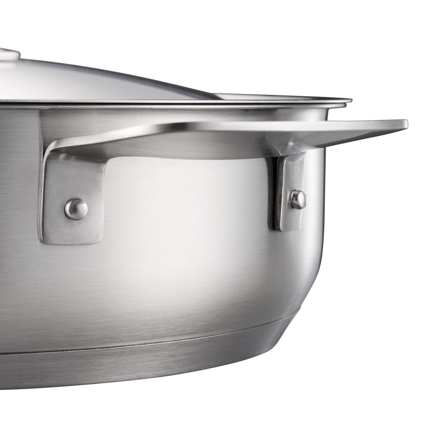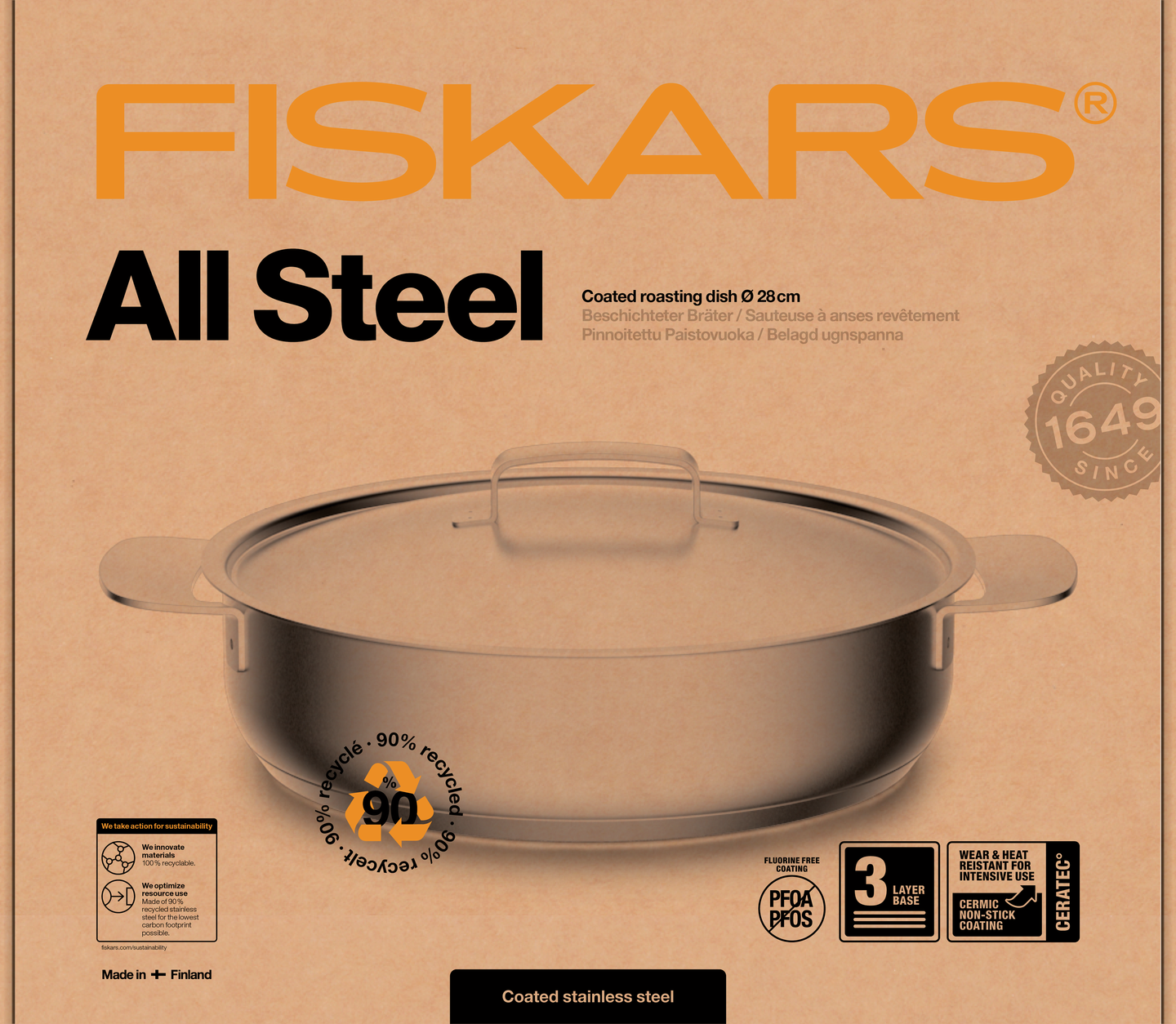 Fiskars All Steel -paistovuoka (28 cm) tarjoaa ensiluokkaisen ruoanlaittokokemuksen. Sen valmistuksessa on käytetty korkealaatuista ja kestävää, 90-prosenttisesti kierrätettyä ruostumatonta terästä tuotantojätteen määrän vähentämiseksi. Paistovuoka kestää kovaakin käyttöä ja takaa erinomaisen paistotuloksen tarttumattoman Ceratec-pinnoitteensa ansiosta, joka ruskistaa ruoan kauniisti ja kestää myös korkeita lämpötiloja. Paksu kolmikerroksinen pohja lämpenee tehokkaasti ja tasaisesti kaikenlaisilla liesillä. Paistovuoan sisäpuolella on mitta-asteikko, ja siinä on turvalliset uuninkestävät kahvat ja höyryaukollinen kansi. Paistovuoan ajaton, yksinkertaisen tyylikäs muotoiltu sopii moderniin keittiöön ja entistä kestävämpään ruoanlaittoon. Valmistettu Suomessa luontoa säästäen.