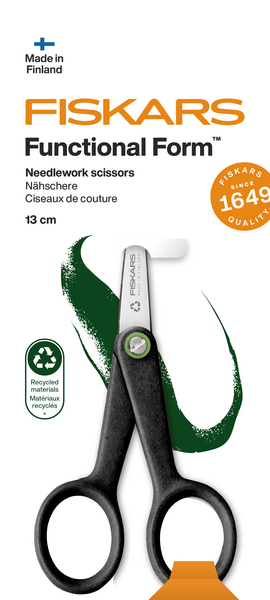Fiskars Functional Form ReNew ompelusakset ovat täydellinen valinta tarkkuutta vaativiin tehtäviin, sakset on valmistettu vähintään 70 %:sti kierrätysmateriaaleista. Korkealaatuiset ja terävät, ruostumattomasta teräksestä valmistetut terät on suunniteltu yksityiskohtaisiin leikkuutehtäviin ja ahtaisiin paikkoihin. Kahva on valmistettu kierrätetyn muovin ja lasikuidun yhdistelmästä. FF ReNew sakset on valmistettu Suomessa ympäristösertifioidulla tehtaallamme. Sakset on viimeistelty käsin, ja suunniteltu sekä oikea- että vasenkätisille.