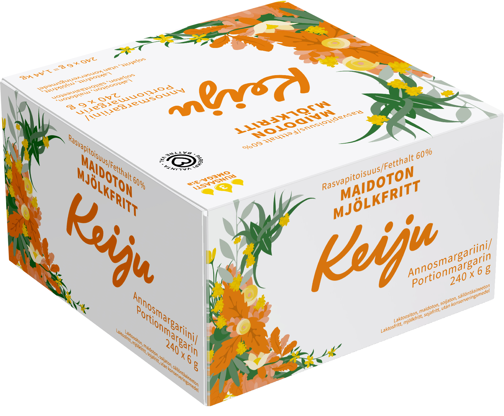 Keiju Catering Margariini 60 240 x 6 g on maidoton ja laktoositon maukas yleislevite, joka sopii hyvin lähes kaikille ruokavalioille. Tuote on rasvahappokoostumukseltaan ravitsemussuositusten mukainen ja kokonaan kasvipohjainen, ja sopii siksi hienosti myös vegaaniseen ruokavalioon. Pakattu hygieniseen 6 g:n annospakkaukseen. Valmistettu Suomessa.