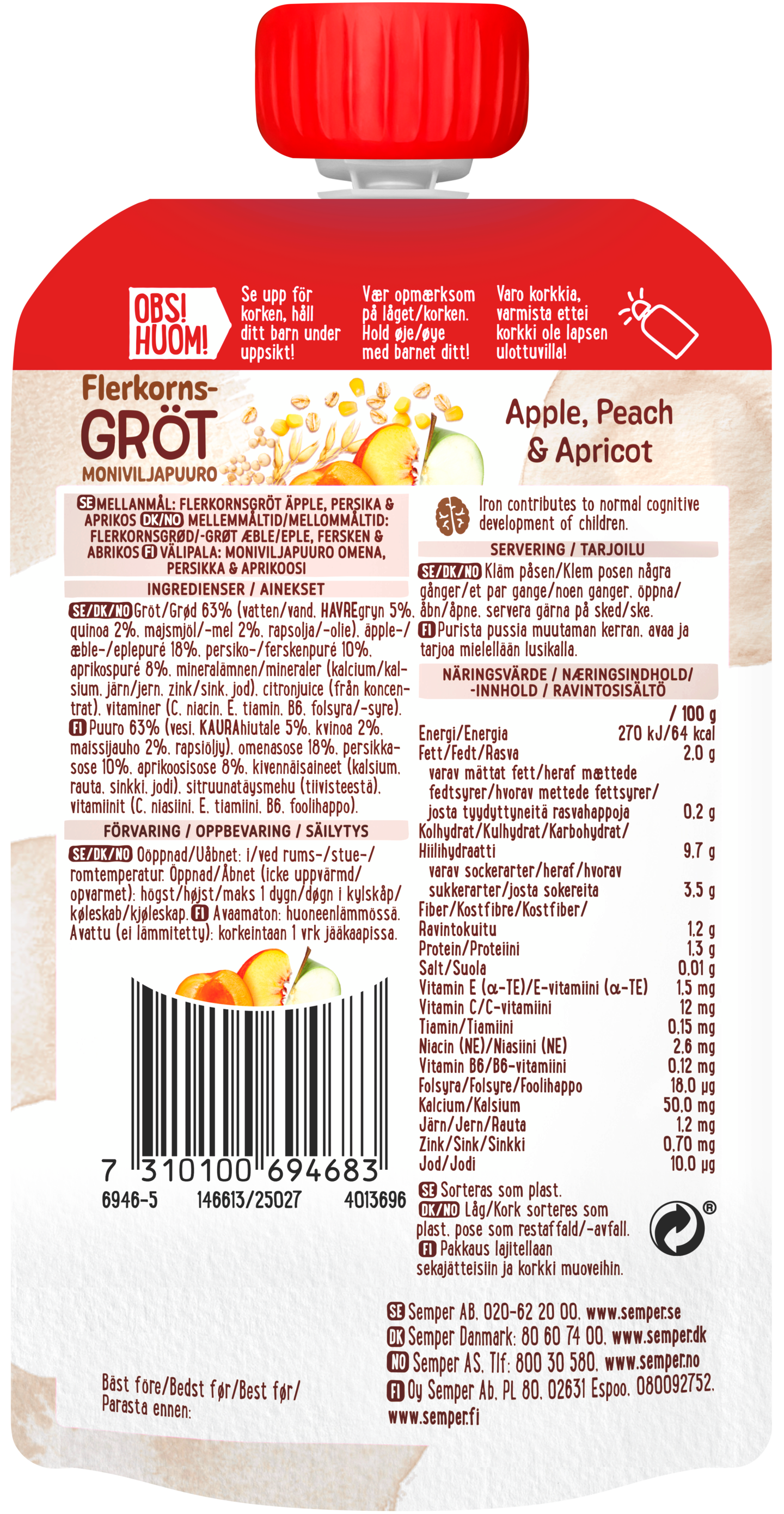 Semperin moniviljapuuro sisälää kolmea erilasta viljaa: kauraa, kvinoaa ja maissia sekä omenaa, persikkaa ja aprikoosia. Valmispuuro on herkullinen välipala lapselle. Siinä on vähintään 50 % puuroa, ja sitä on täydennetty raudalla, kalsiumilla ja C-vitamiinilla. Puuro sopii lapsille 6 kuukauden iästä alkaen. Ei lisättyä sokeria tai makeita mehutiivisteitä, sisältää vain hedelmien luontaisen sokerin. Puuroon on lisätty lapselle tärkeitä vitamiineja ja kivennäisaineita, kuten rautaa ja sinkkiä. Puuropussi on hyvä eväs retkelle tai kotona nautittavaksi. Kätevä pussukka, josta lapsi voi syödä suoraan tai josta voi helposti annostella lusikkaan. Puuro säilyy avaamattomana huoneenlämmössä. Tarjoa sellaisenaan huoneenlämpöisenä tai lautasella lämmitettynä. Kaikki Semper lastenruoka valmistetaan lastenruokalainsäädännön asettamien vaatimusten mukaisesti ilman väri-, säilöntä- tai makeutusaineita.