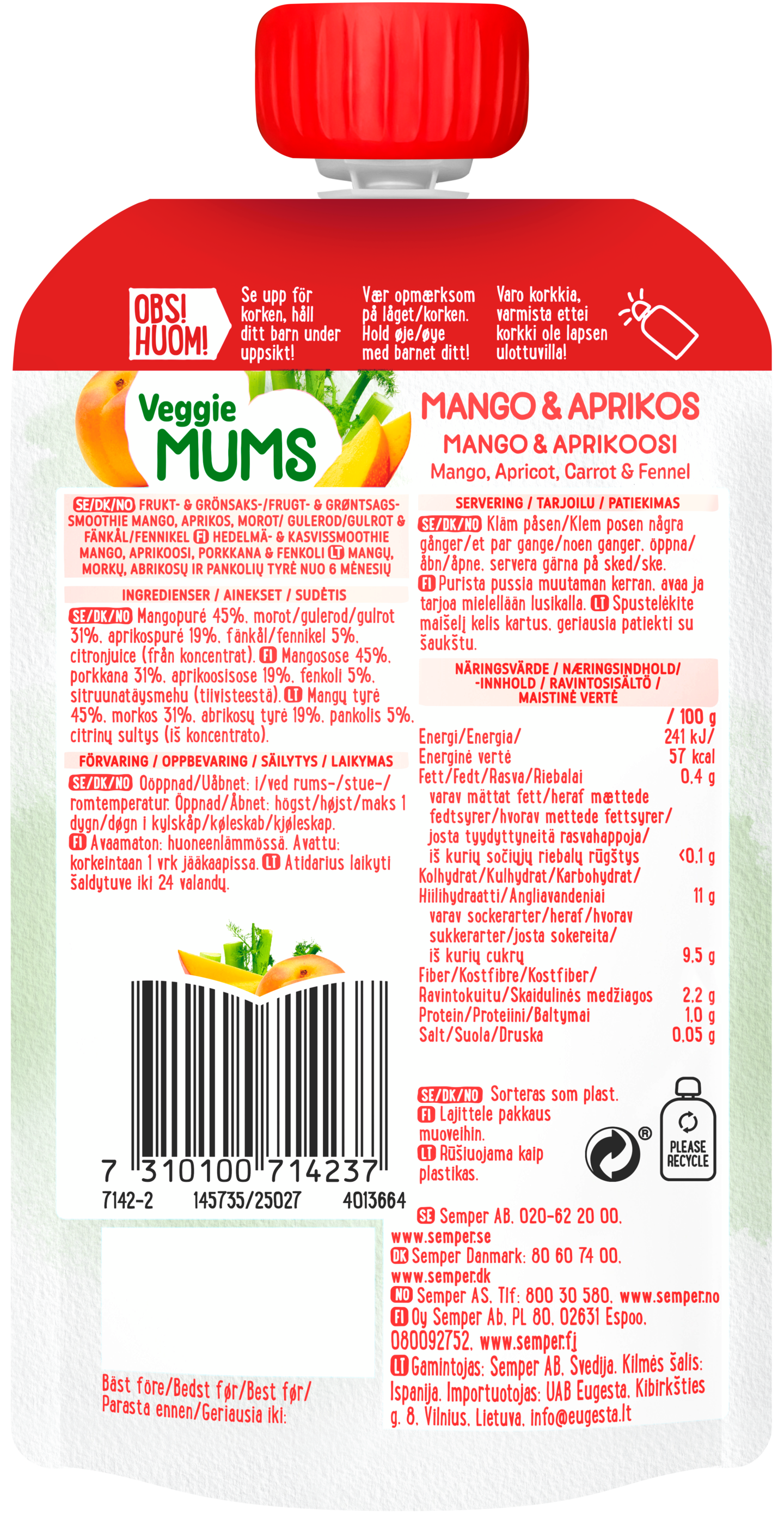 Hedelmäsose, joka sisältää jopa 36 % kasviksia. Semper Veggiemums mangolla, aprikoosilla, porkkanalla ja fenkolilla on helppo ja herkullinen välipala. Kasvikset tuovat soseeseen kuitua ja tasapainottavat hedelmien makeutta. Tämän soseen avulla lisäät helposti lapsesi kasvisten saantia. Sopii lapsen ruokavalioon 6 kuukaudesta alkaen.