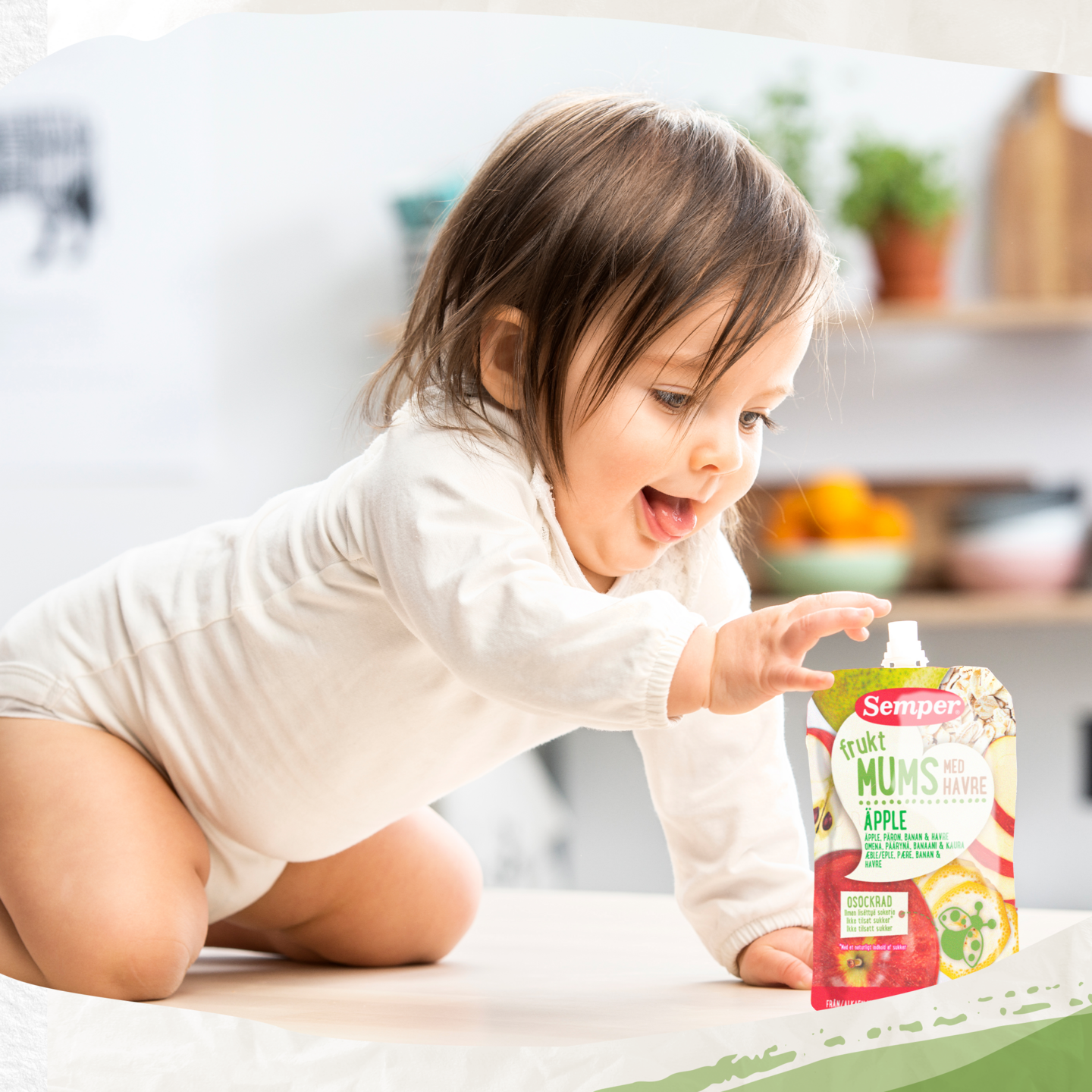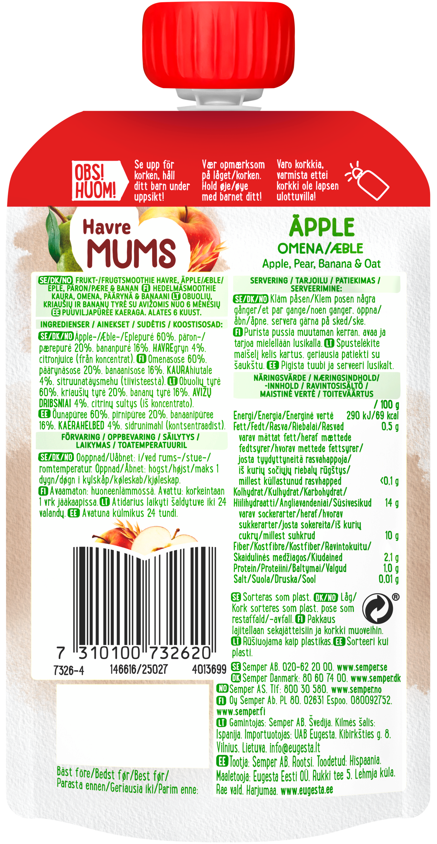 Semper Havremums Omena & kaura on raikas ja herkullinen omenaa, päärynää, banaania ja kaurahiutaleita sisältävä hedelmäsose. Sopiva lasten ja koko perheen terveellinen välipala smoothie tai jälkiruoka. Sose soveltuu lapsille noin 6 kuukauden iästä alkaen. Hedelmäsosepussi on hyvä eväs retkelle tai kotona nautittavaksi. Kätevä pussukka, josta lapsi voi itse pitää kiinni. Sokeroimaton ja maidoton. Välipalapussi ei sisällä lisättyä sokeria tai makeita mehuja. Hedelmävälipala säilyy avaamattomana huoneenlämmössä. Kaikki Semper lastenruoka on valmistettu ilman säilöntäaineita.