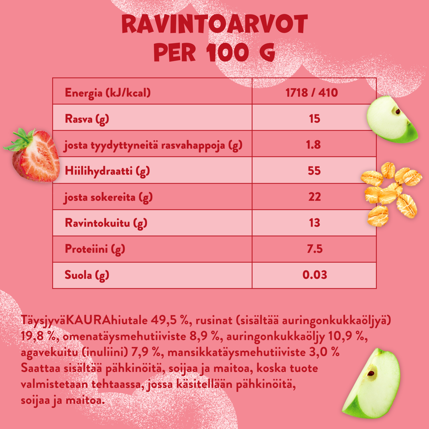 Pehmeä omenan ja mansikan makuinen kaurapatukka, joka sopii täydellisesti välipalaksi jo pienille lapsille. 50% täysjyväkauraa! Ei lisättyä sokeria.