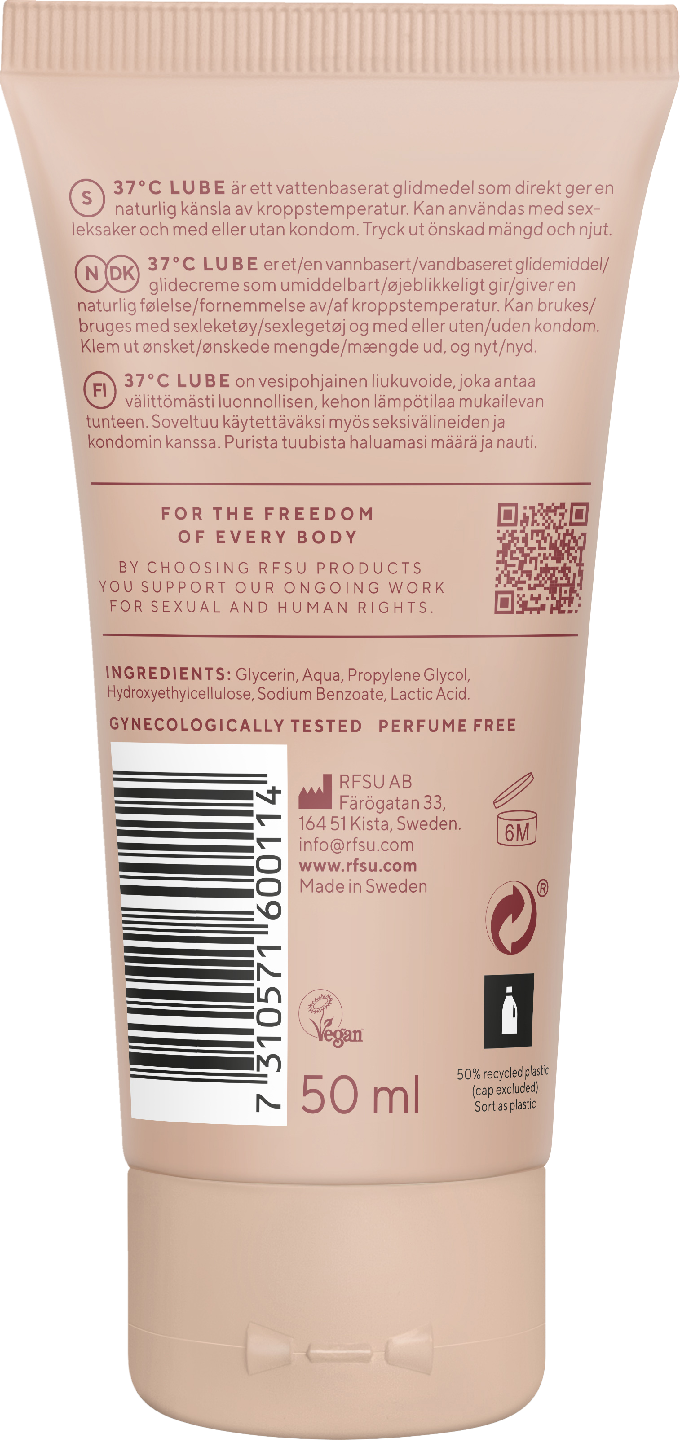 RFSU 37°C Lube on vesipohjainen liukuvoide, joka antaa käytön aikana kehon lämpötilaa jäljittelevän tunteen. Ainutlaatuinen koostumus, joka eroaa muista vesipohjaisista liukuvoiteista, on suunniteltu jäljittelemään kehon omaa lämpötilaa ihokosketuksessa, mikä luo luonnollisemman ja aidomman kokemuksen. Liukuvoiteella on sileä rakenne, joka tuntuu mukavalta iholla ja tarjoaa pitkäkestoisen liu'un sekä lyhyille että pidemmille intiimeille hetkille. Se sopii erityisesti niille, jotka haluavat lisätä läheisyyden ja kehon lämmön tunnetta – olitpa sitten yksin tai jonkun kanssa. Liukuvoide on gynekologisesti testattu ja hajusteeton. 100 % vegaaninen ja The Vegan Societyn sertifioima.