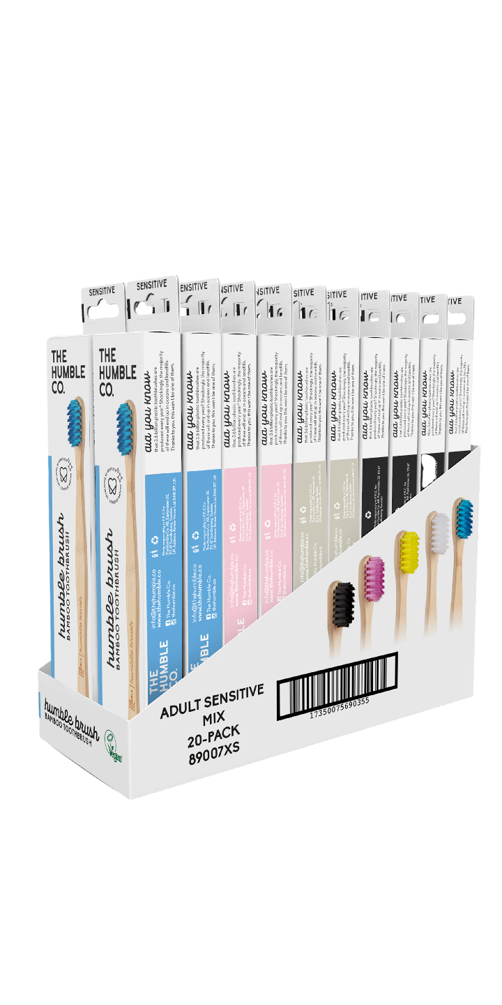 Humble Brush on kestävä valinta! Humble Brush Sensitive hammasharjan erittäin pehmeät harjakset hoitavat hampaita ja ikeniä entistä hellävaraisemmin. Humble Brush hammasharjan varsi on 100 % biohajoavaa bambua Bambu on maapallon nopeimmin kasvava materiaali Se on luonnostaan antibakteerista, eikä sen viljelyssä käytetä lannoitteita tai torjunta-aineita. Harja on pakattu läpinäkyvään ja biohajoavaan, täysin kasvipohjaiseen kääreeseen. Harjan pahvipakkaus on tehty 100 % kierrätysmateriaalista .Humble Brushin varren voi katkaista kompostiin, mutta harjaksia valitettavasti ei. Ne hajoavat biologisesti 2-3 vuodessa jättämättä minkäänlaisia toksiineja jälkeensä. Jokaisesta myydystä harjasta Humble Brush lahjoittaa yhden harjan kehitysapuun Humble Smile Foundationin kautta 5 kpl väri lajitelma. Aikuisten koko