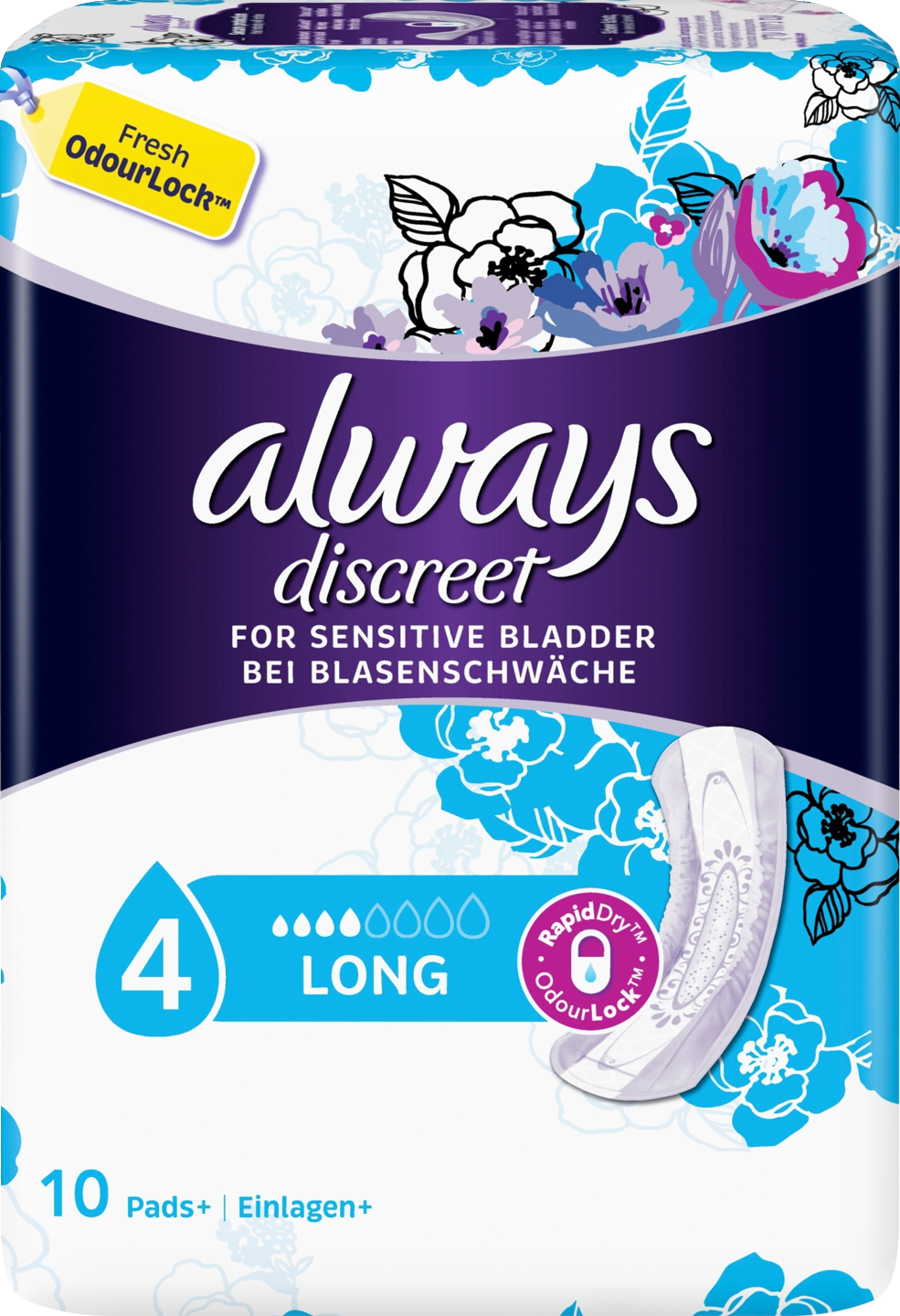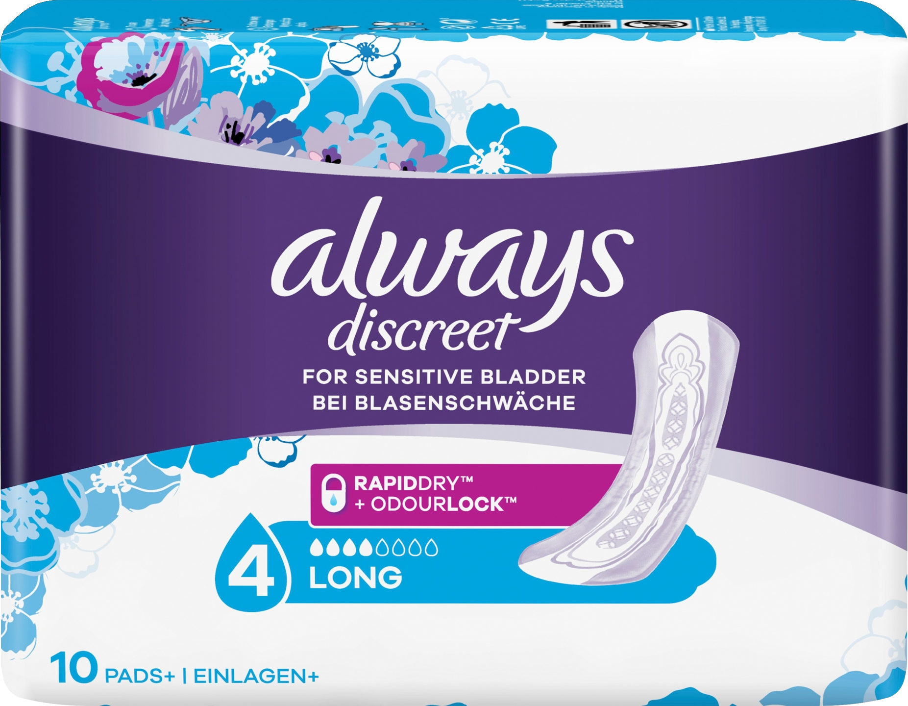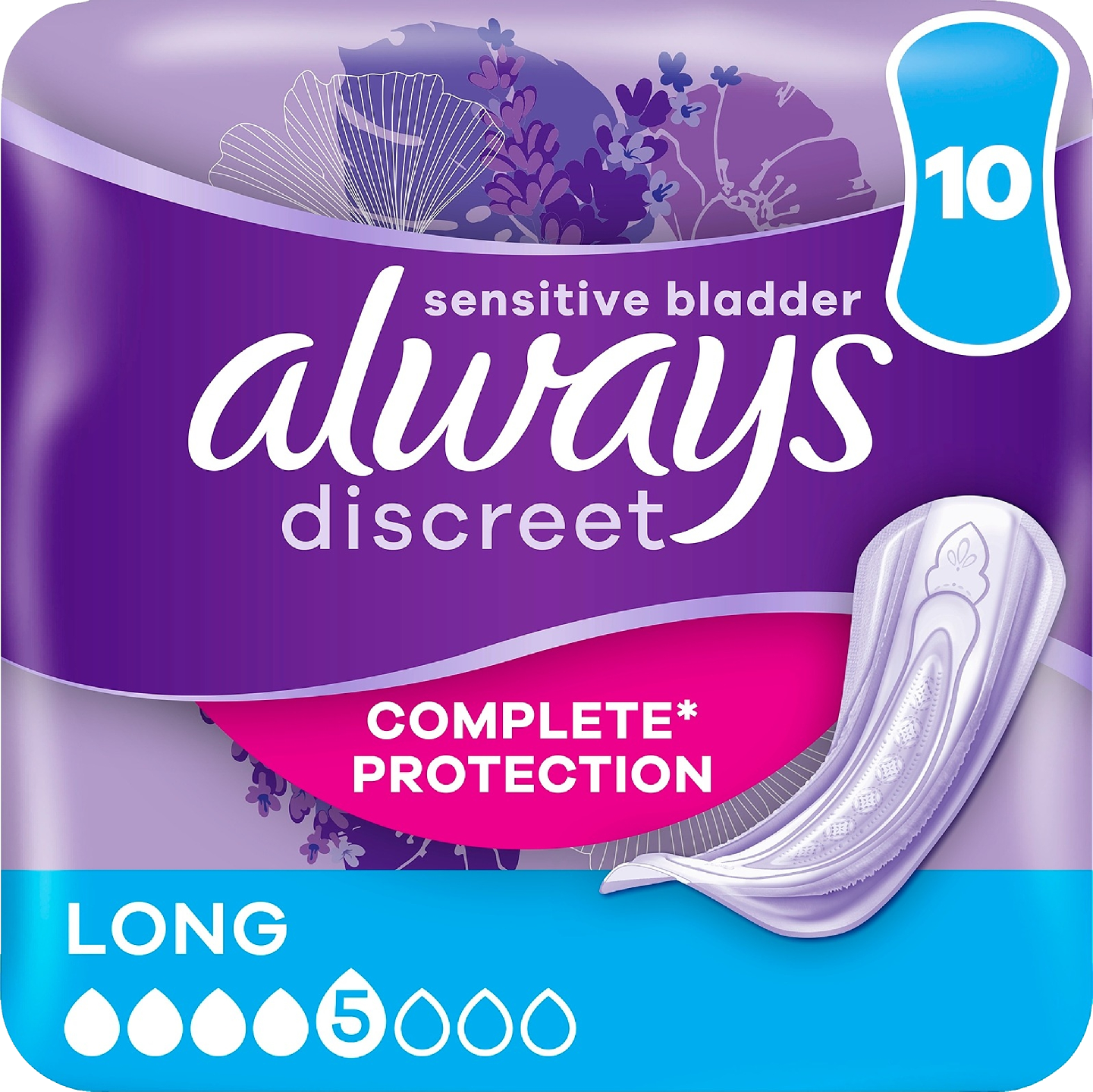 Always Discreet Long -inkontinenssisuojat tarjoavat täyden suojaavuuden ja huomaamattoman istuvuuden. Side on suunniteltu suojaamaan luotettavasti ohivuodoilta, hallitsemaan hajuja, tuntumaan kuivalta, pehmeältä ja hellävaraiselta ihoa vasten sekä istumaan huomaamattomasti. Jos aivastaminen tai nauraminen aiheuttavat virtsankarkailua, Always Discreet Long -siteet suojaavat tehokkaasti ja huomaamattomasti, jotta voit tuntea olosi varmaksi.