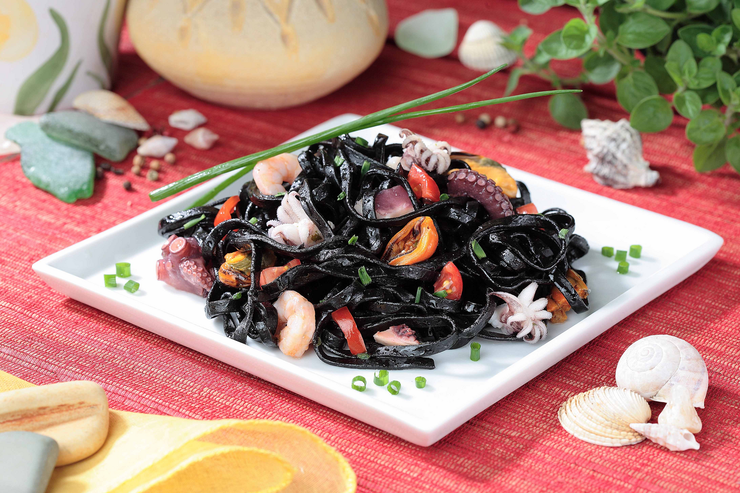 Esikeitetty ja pikapakastettu musta nauhapasta durumvehnäjauhosta. Kaunis musta väri seepiasta.