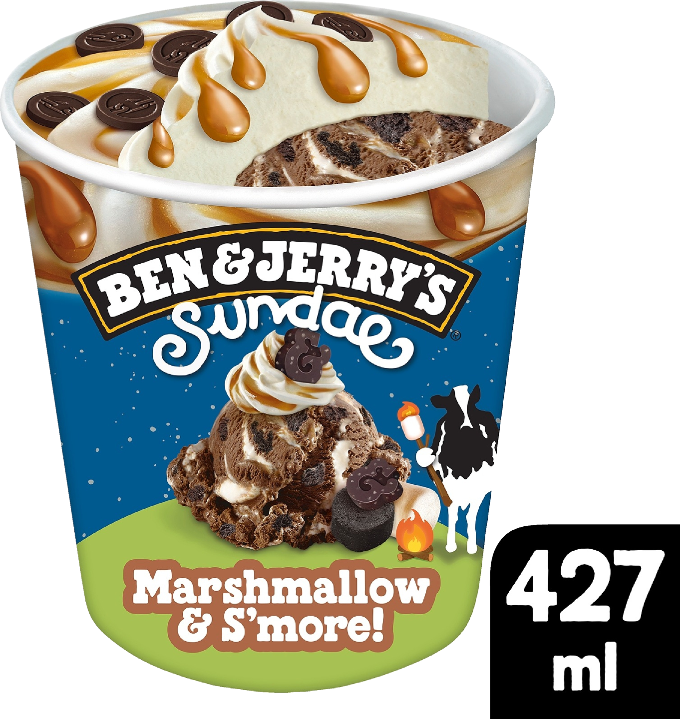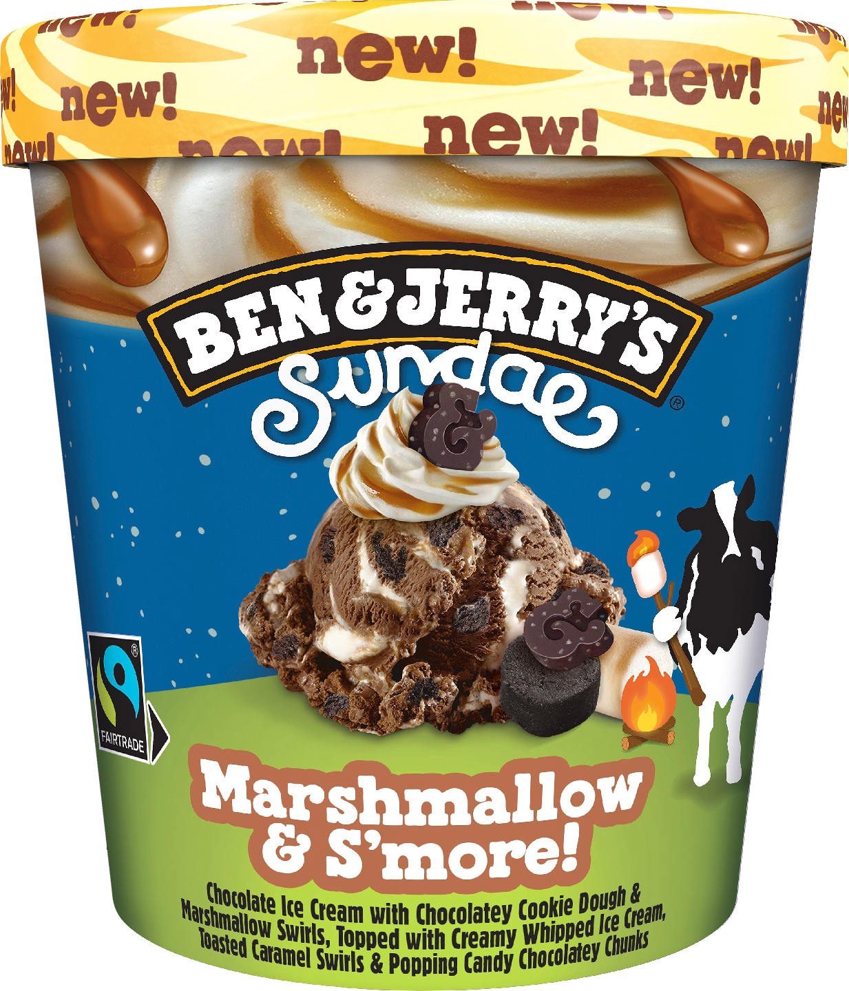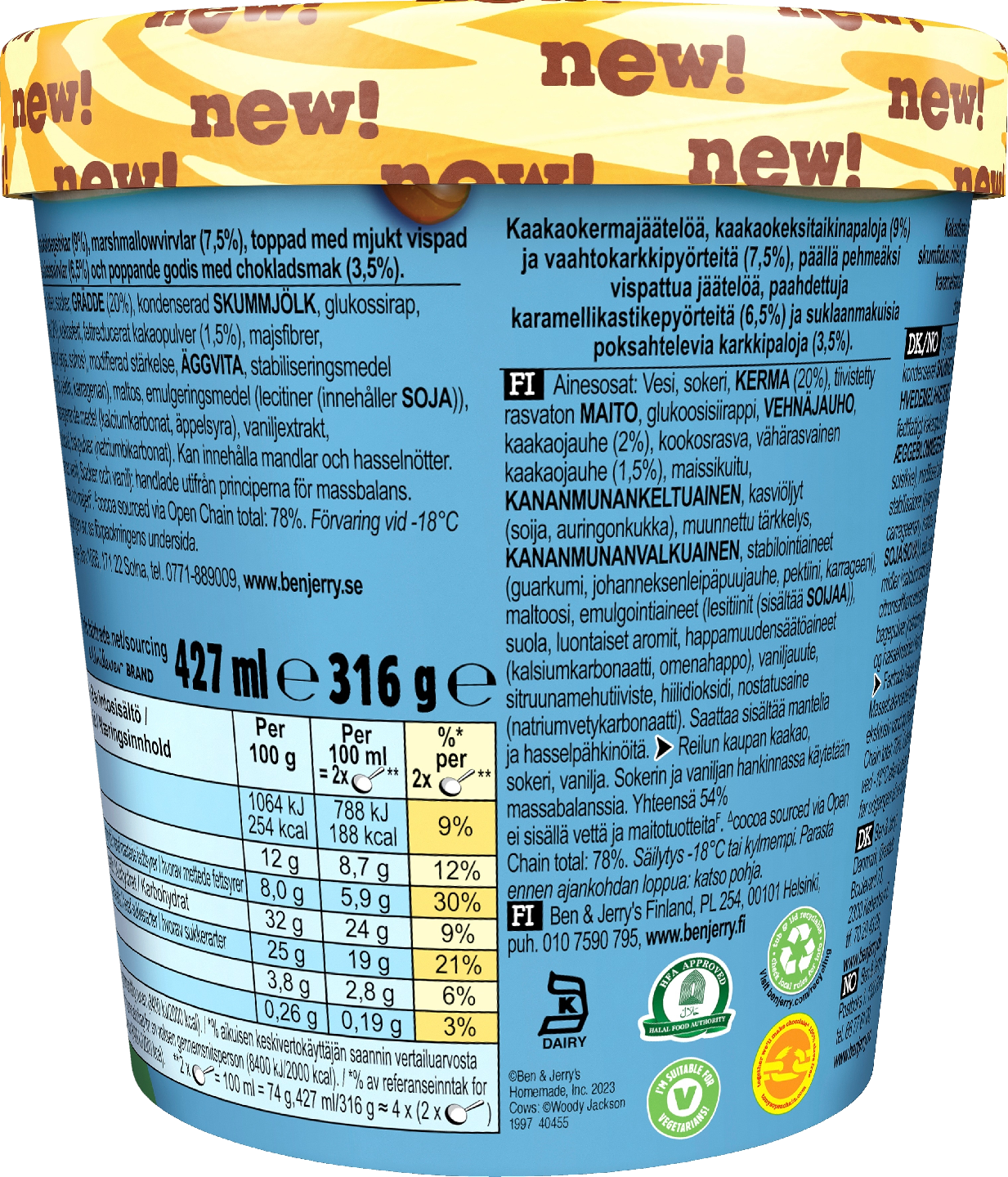 Jälkiruoka, jossa yhdistyy suklaa, jäätelö ja herkullisen makuiset yllätykset! Sellainen on Ben & Jerry's Marshmallow & S'more!: kaakaokermajäätelöä, suklaisia keksitaikinapaloja & vaahtokarkkipyörteitä, päällä pehmeäksi vispattua jäätelöä, paahdettuja karamellikastikepyörteitä & suklaanmakuisia poksahtelevia karkkipaloja. Ben & Jerry's Marshmallow & S'more!-jäätelöllä on sekä kosher- että halal-sertifikaatti. Ben & Jerry's -jäätelön valmistukseen käytetään Reilun kaupan sertifioitua sokeria, kaakaota ja vaniljaa. Muista pitää huolta siitä, että jäätelö säilyy hyvin, kun ostat sitä pakasteeseen. Säilytä jäätelö -18 asteessa tai kylmemmässä. Jäätelön rakastajana tiedät, että näin se säilyttää parhaiten makunsa. Jäätelö on pakkauksessa, joka on valmistettu vastuullisesti. Kuten kaikki Ben & Jerry's pakkaukset. Kaikki alkoi siitä, kun kaksi kaveria alkoi myydä Vermontin Burlingtonissa sijaitsevasta kunnostetusta huoltoasemasta jäätelöä vuonna 1978. Heidän perustamastaan jäätelöyrityksestä tuli yhtä legendaarinen kuin jäätelöstä itsestään. Se oli seikkailun alku, joka on yhtä myyttinen kuin jäätelömme on hyvää. Jäätelömme tunnetaan nyt syrjäisilläkin seuduilla ja vaikeasti lausuttavilla nimillä ympäri maailmaa. Ben & Jerry's -jäätelön valmistukseen käytetään Reilun kaupan sertifioitua sokeria, kaakaota ja vaniljaa. Lisäksi jäätelö pakataan kestävään ja vastuullisesti tuotettuun pakkaukseen. Ei liene mitään niin ikonista jäätelöpurkkia kuin Ben & Jerry's -jäätelöllä. Asia ei kuitenkaan aina ole ollut niin! Varhaisina vuosina Ben ja Jerry eivät – usko tai älä – myyneet jäätelöä purkeissa, vaan irtopalloina Burlingtonissa, Vermontissa. Oli alun perin Benin idea kokeilla pakata herkullista jäätelöä purkkeihin kotiinvietäväksi. Loppu, kuten tapaamme sanoa, on jäätelöhistoriaa. Mutta nyt riittää puheet. Nautitaan jäätelöstä. Tutustu laajaan valikoimaamme osoitteessa benjerry.fi