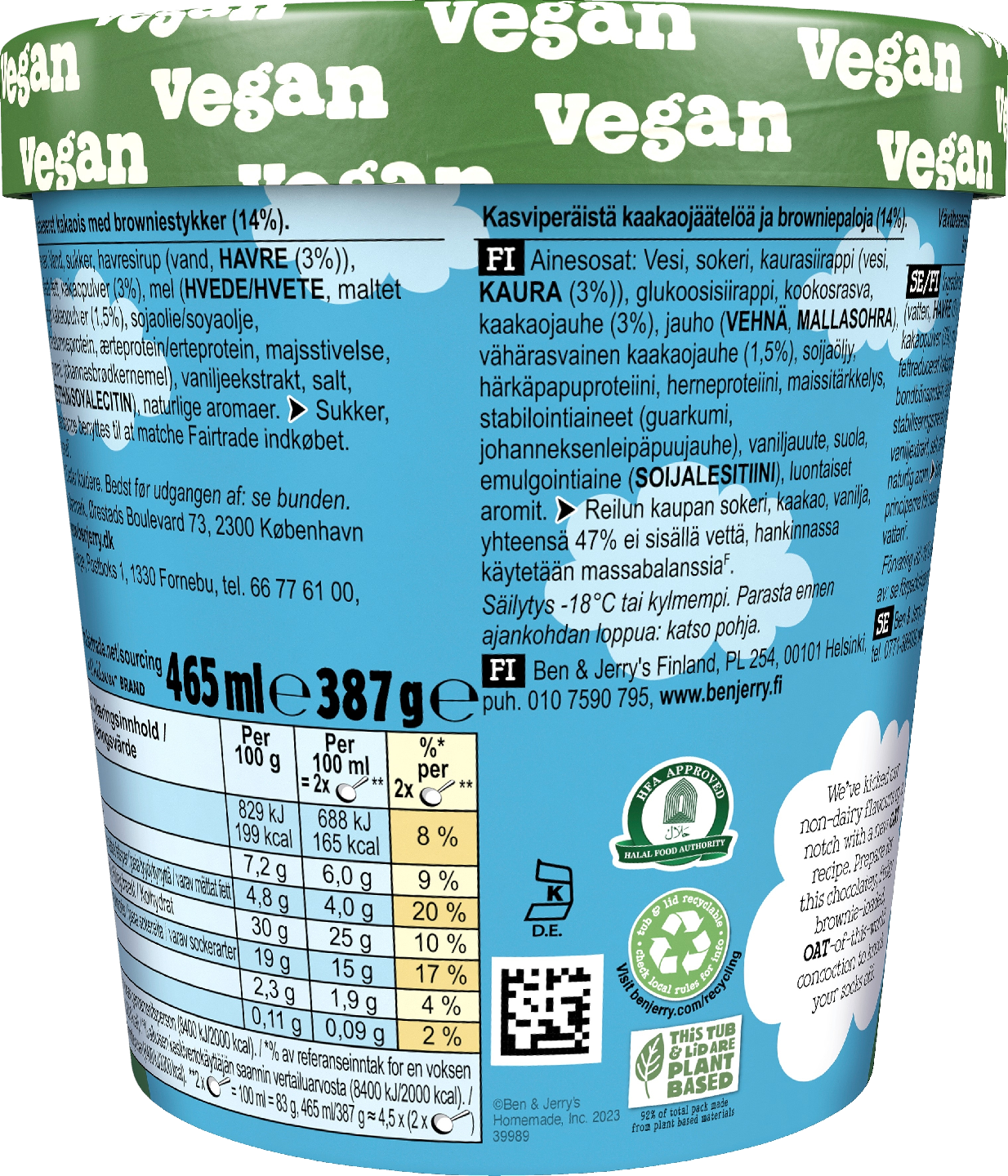 Vegaaninen suklaajäätelö suklaabrownieilla. Ben & Jerry'sin tarina alkoi, kun kaksi kaveria alkoi myydä jäätelöä kunnostetulla huoltoasemalla Burlingtonissa, Vermontissa, vuonna 1978. Heidän perustamastaan jäätelöyrityksestä tuli yhtä legendaarinen kuin itse jäätelöstä. Jäätelömme tunnetaan nykyään syrjäisilläkin alueilla ja vaikeasti lausuttavilla nimillä ympäri maailmaa. Ben & Jerry's -jäätelö valmistetaan Reilun kaupan sertifioidusta sokerista, kaakaosta ja vaniljasta.