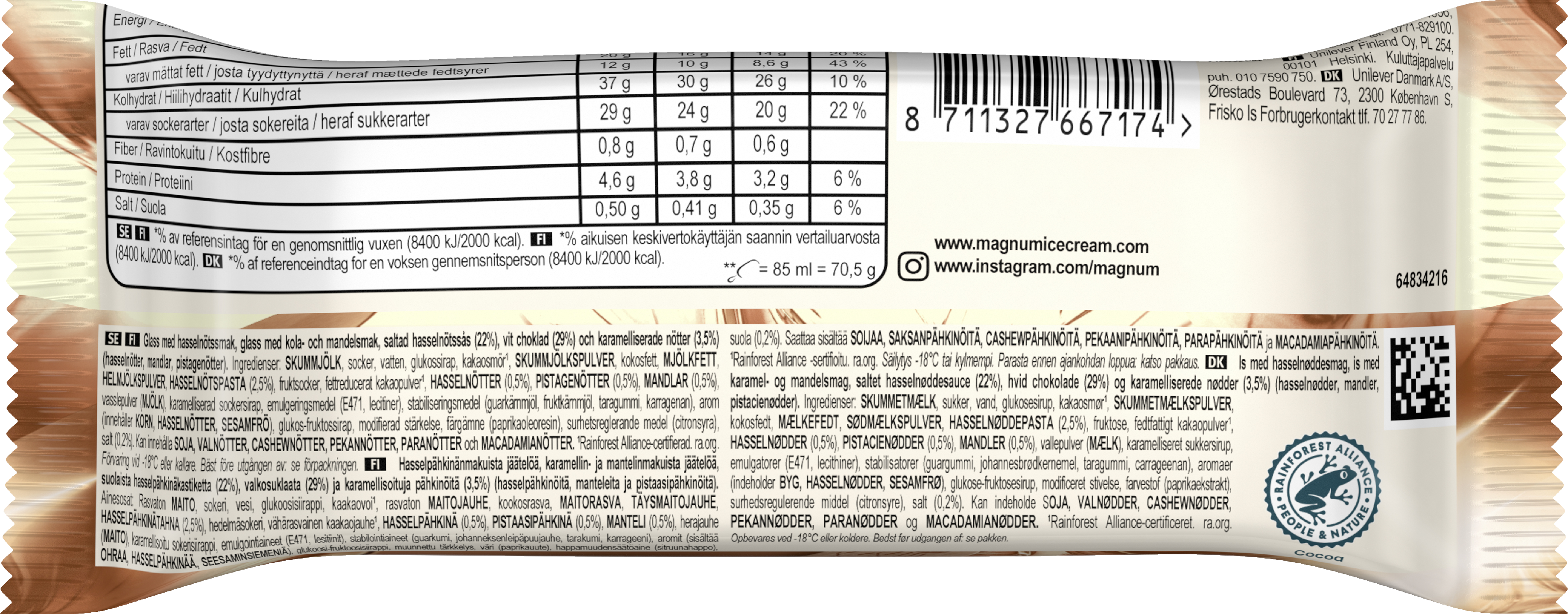 Magnum Utopia Double Hazelnut Jäätelöpuikko on kerrassaan uskomaton makuelämys ja ylellinen jäätelö! Se on täynnä kaakaohasselpähkinäjäätelöä ja karamellisoitua mantelijäätelöä, jotka on päällystetty suolaisella hasselpähkinäkastikkeella. Kaiken kruunaa paksu rapea kuori valkoista Magnum-suklaata ja karamellisoituja hasselpähkinöitä, manteleita ja pistaaseja. Magnum Utopia Double Hazelnut Jäätelöpuikko tarjoaa upean makunautinnon, josta et vain saa tarpeeksesi. Se on täydellinen välipala, jälkiruoka tai leffaillan herkku. Uskomaton pähkinäinen jäätelönautinto, joka jää taatusti mieleen! Nauti jäätelöistä yksin tai jaa ylellinen jäätelöhetki ystäviesi kanssa. Magnum-jäätelö tarjoaa ainutlaatuisen nautinnon. Uskomme, että päivä ilman nautintoa on hukkaan heitetty päivä, koska ilo ja nautinto tekevät elämästä elämisen arvoista. Jos et halua syödä kaikkea jäätelöä kerralla (ja maltat säästää sen), säilytä sitä -18 °C:ssa tai kylmemmässä. Kun jokainen yksityiskohta ratkaisee, lopputulos on poikkeuksellinen. Siksi valitsemme kaikki raaka-aineemme huolellisesti ja palkkaamme asiantuntijoita luomaan tuotteemme intohimoisesti ja tarkasti. Tiivis yhteistyö Rainforest Alliancen kanssa takaa, että käyttämämme kaakao on vastuullisesti tuotettua ja Rainforest Alliance -sertifioitua. Kaakaolla on edessään vielä pitkä matka ennen kuin siitä tulee Magnum-suklaata. Laatu ja kestävyys ovat meille tärkeitä koko matkan ajan. Magnum rohkaisee kaikkia tarttumaan hetkeen ja hemmottelemaan itseään pienellä ylellisyydellä. Vuodesta 1989 lähtien nautiskelijat ympäri maailmaa ovat voineet nauttia poikkeuksellisesta suklaa- ja jäätelökokemuksesta. Magnumin jäätelöpuikkoja saa eri makuisina. Valikoimastamme löytyy jäätelö jokaiseen makuun, vaihtoehtoja myös vegaaneille. Tutustu myös Magnumin erilaisiin monipakkauksiin, joista riittää jaettavaa ystävien kesken. Kokeile vaikka Magnum White Chocolate, Magnum Classic, Magnum Almond tai Magnum Salted Caramel -jäätelöä tai valitse vegaaninen vaihtoehto, kuten Magnum Chill. Mikä maku on sinun suosikkisi?