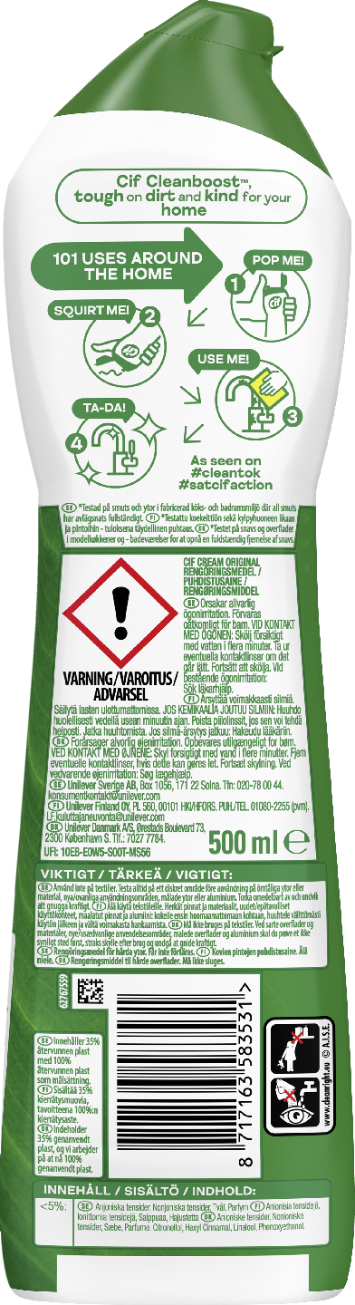 Tutustu Cif Original -puhdistuaineen uskomattomaan tehoon. Voidemaisen hankausaineen likaa irrottavia mikropartikkeleita sisältävä koostumus poistaa pinttyneimmänkin lian ja ikävän näköiset kalkkijäämät ja -saostumat. Uuden koostumuksen ansiosta puhdistetulle pinnalle riittää nyt vähempi huuhtelu, jolloin säästät vettä. Cif Cream Original puhdistusaineessa on puhtaan raikas tuoksu. Cif Cream Original sisältää 100 % luonnollisia puhdistushiukkasia. Nestemäinen hankausaine on tarkoitettu koville pinnoille, joissa on juurtunutta likaa, rasvaa ja kalkkijäämiä. Cif Original on hankausaine. Se on hellävarainen mutta tehokas yleispuhdistusaine, joka poistaa lian jättämättä jälkiä. Cif Cream Original soveltuu käytettäväksi lähes kaikille kodin pinnoille. Keittiö tai kylpyhuone – Cif puhdistaa pinttyneetkin likatahrat! Annostele suoraan pinnalle tai kostealle sienelle tai liinalle. Hankaa lika pois. Huuhtele tai kuivaa. Cif Cream Original soveltuu mainiosti esimerkiksi keittotason rasvanpoistoon ja muuhun puhdistamiseen, kuten kylpyammeiden, pesualtaiden sekä laattojen pesuun. Cif-pullo on valmistettu kierrätetystä muovista ja se on täysin uudelleen kierrätettävä. Cif Cream Original on nyt parempi kuin koskaan, hoitaa puhdistustyöt ongelmitta, ja on helppo huuhdella pois. Pieni määrä auttaa poistamaan kaiken tyyppisen lian, myös sellaisen, jonka puhdistus näyttää mahdollomalta, kuten kuivunut rasva ja pinttynyt kalkki. Cif Cream Original sisältää luonnollisia puhdistusainehiukkasia, joten voit luottaa siihen. Tutustu myös muihin Cif-siivous ja -puhdistustuotteisiin, joilla saat aikaan upeita tuloksia, kuten antibakteeriset puhdistuspyyhkeet, yleispuhdistussuihke, desinfioivat yleispuhdistusliinat, ikkunoiden puhdistukseen tarkoitettu Cif Power & Shine Spray tai vaikka supertehokkaaseen kylpyhuoneen puhdistusaineeseen, suihkutettavaan Power & Shine Bathroom -suihkeeseen. Cif - Tehokas puhdistus!