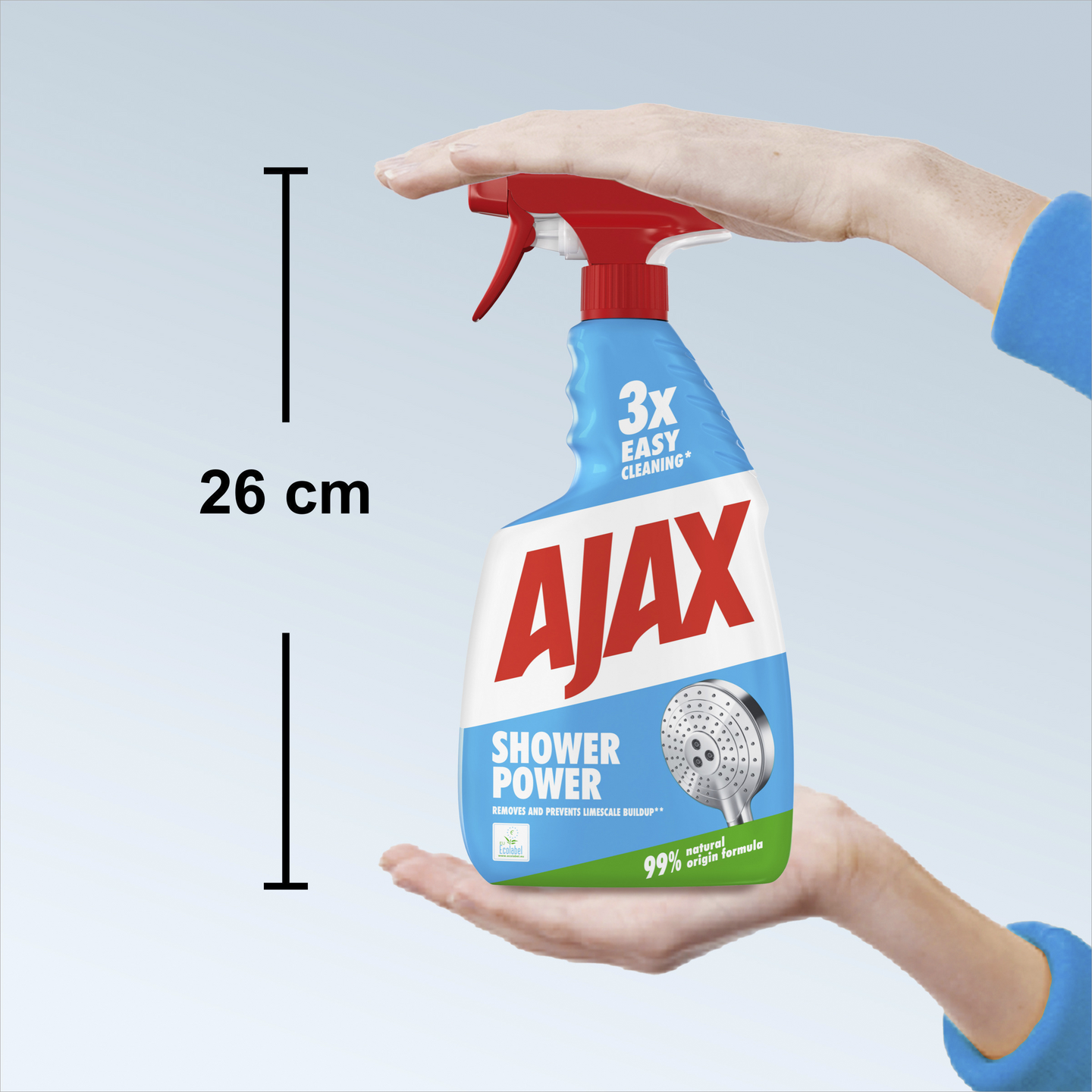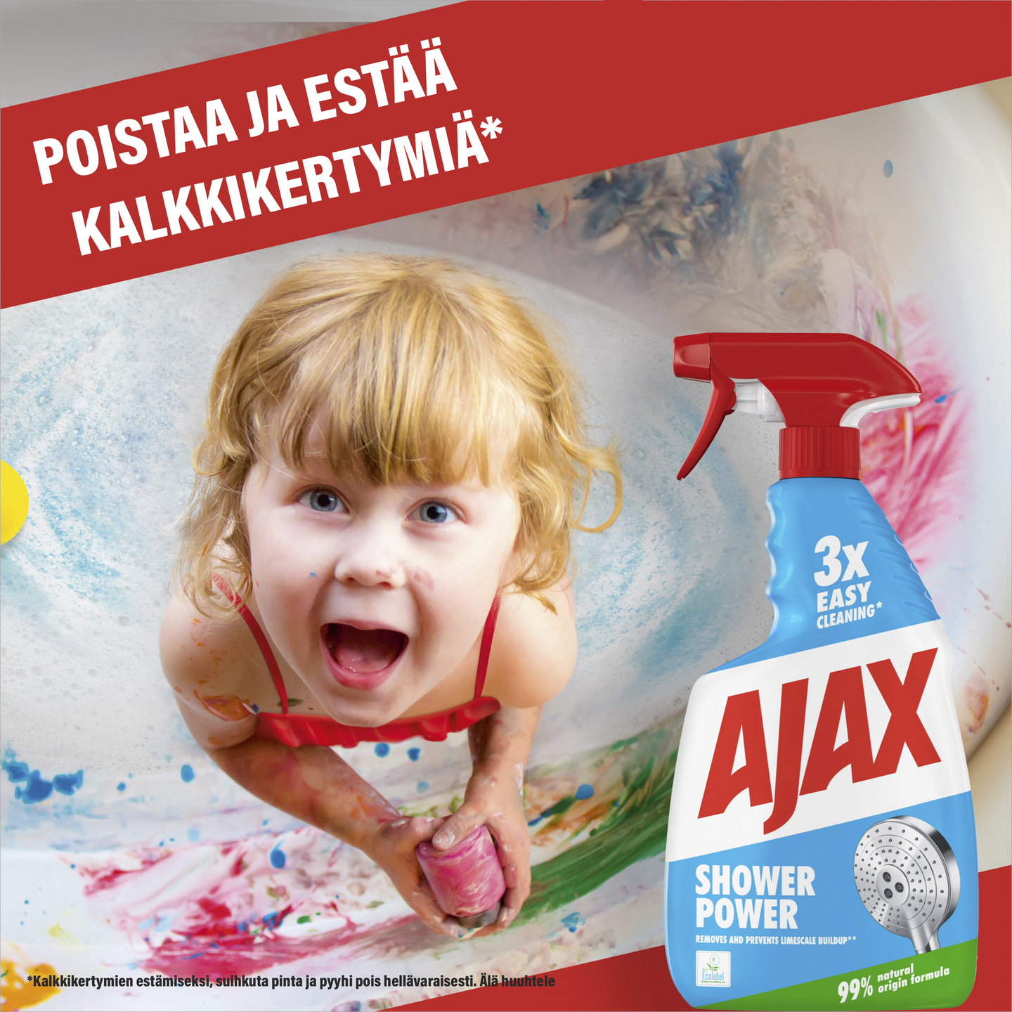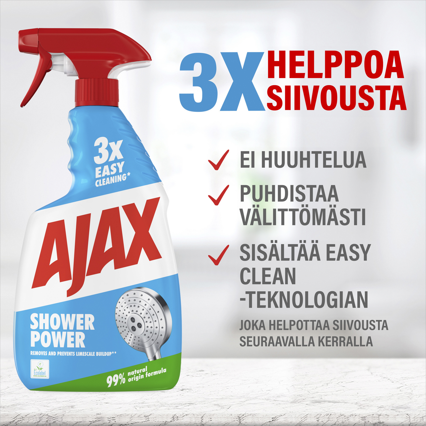 Ajax Shower Power puhdistussuihke poistaa kalkin tehokkaasti ja muodostaa pinnoille suojaavan kalvon, joka ehkäisee kalkkisaostumien ja saippuajälkien muodostumista. Lopputulos on kiiltävän puhdas ja raikkaan tuoksuinen. Ecolabel-sertifioitu puhdistusaine, jonka ainesosat ovat 99% luonnollista alkuperää.