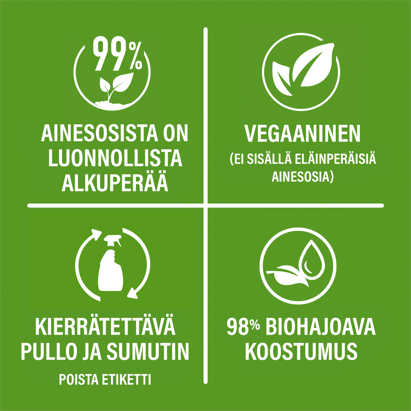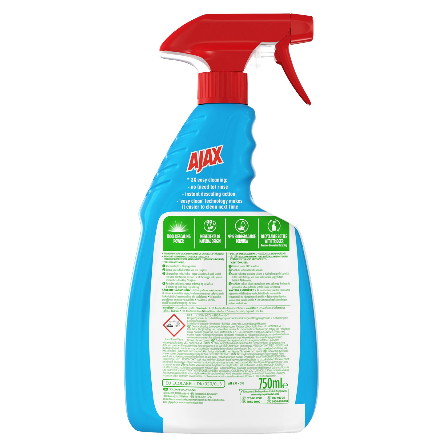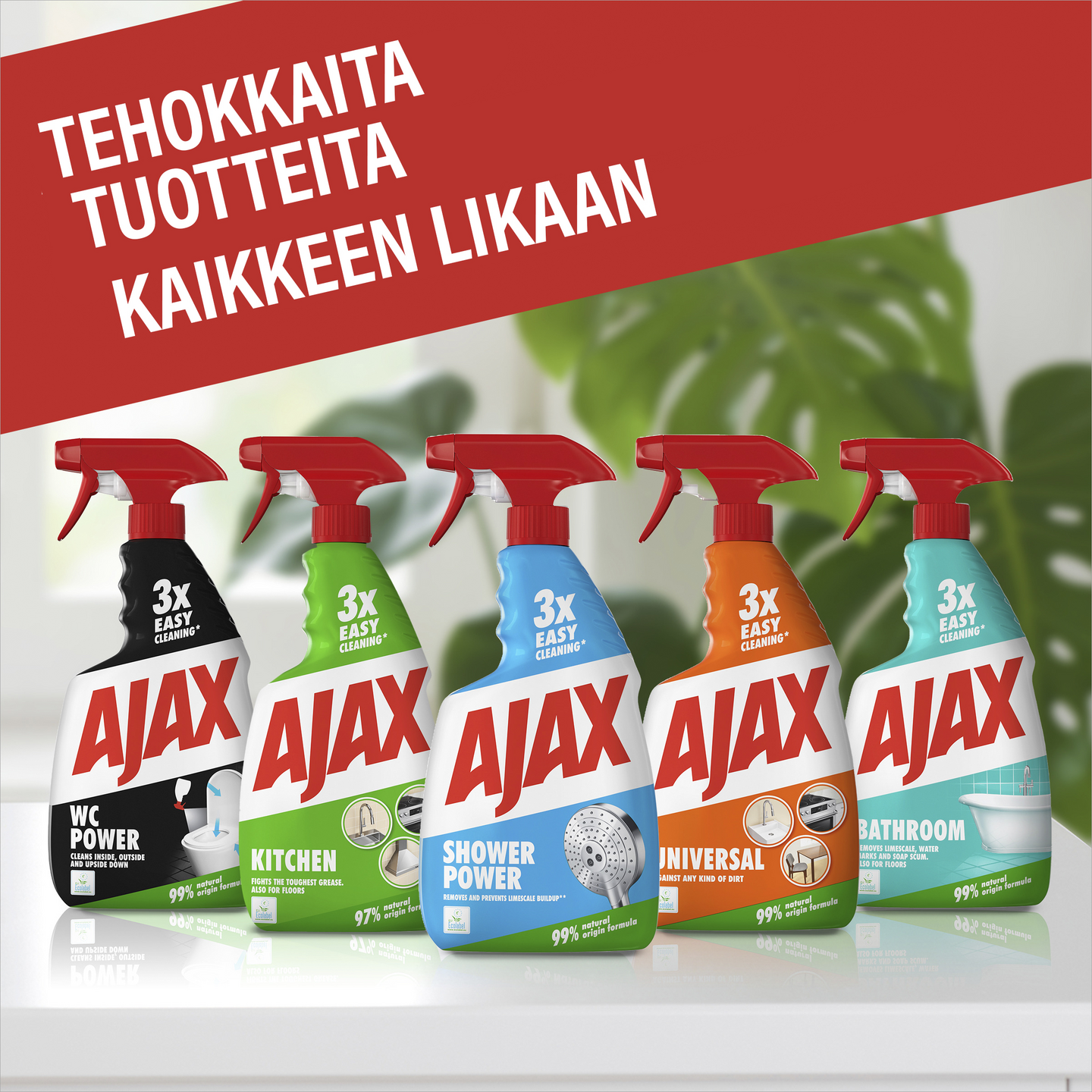 Ajax Shower Power puhdistussuihke poistaa kalkin tehokkaasti ja muodostaa pinnoille suojaavan kalvon, joka ehkäisee kalkkisaostumien ja saippuajälkien muodostumista. Lopputulos on kiiltävän puhdas ja raikkaan tuoksuinen. Ecolabel-sertifioitu puhdistusaine, jonka ainesosat ovat 99% luonnollista alkuperää.