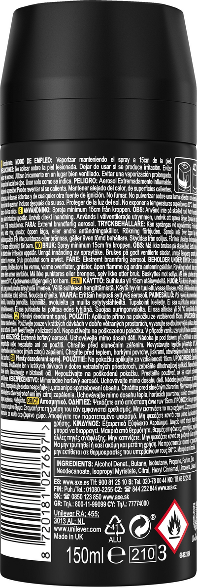 Axe Deodorantti vartalosuihke on täysin uusi ja paranneltu deodorantti koko vartalolle. Nauti Axelle tyypillisestä ikonisesta raikkauden tunteesta sekä deodorantin tuomasta varmuudesta. Axe pitää hienhajun ja epämiellyttävät tuoksut loitolla. Se saa sinut tuoksumaan vastustamattomalta ja raikkaalta koko päivän ajan. Axen vallankumouksellinen uusi Dual Action -sinkkiteknologia poistaa hienhajua aiheuttavat bakteerit. 48 tunnin suoja pahaa hajua vastaan.Et voi koskaan tietää, milloin tilaisuutesi koittaa, joten tarvitset vartalosuihkeen, joka antaa viileän itsevarman olon, mitä ikinä eteesi tuleekin. Axe on vartalosuihke, joka varmistaa, että olet aina valmis mihin tahansa. Axe tarjoaa lukuisia innovatiivisia tuotteita miehille: body spray (vartalosuihke), antiperspirantti ja suihkugeeli. Axe-valikoimastamme löytyy jokaiselle jotakin. Mikset kokeilisi vaikka näitä:• Axe Anarchy: rikas, mausteinen tuoksu, jossa yhdistyvät tuoreet ja hedelmäiset sävyt, santelipuu ja valkoinen meripihka.• Axe Apollo: klassisen maskuliininen tuoksu, jossa on vetovoimaa. Vihreiden hedelmien, santelipuun ja tuoreen salvian raikkaat sävyt pitävät sinut vahvassa otteessaan.Ja monet muut! Kokeile Axe-valikoiman tuotteita ja löydä jokaiseen tilanteeseen paras vaihtoehto. Lupaamme, että tuoksut jännittävältä, upealta ja vastustamattomalta missä ikinä liikut. Lisää vetovoimaasi ja tutustu ennakkoluulottomasti Axen deodorantti- ja antiperspiranttivalikoimaan.Tavoitteemme on, että vuoteen 2025 mennessä kaikki Axen pakkaukset ovat kierrätettäviä tai niissä on käytetty kierrätettyjä materiaaleja. Tervetuloa tulevaisuuteen. Se tuoksuu uskomattoman hyvältä.