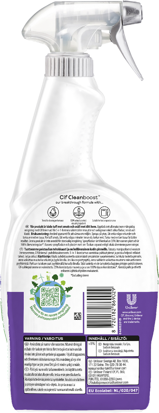 Cif 5in1 Limited edition Universal Cleaner Winter whispers on erinomainen yleispuhdistusaine, joka puhdistaa kodin pinnat tehokkaasti. Siinä on viisi tehokasta ominaisuutta ja se on ihanteellinen ratkaisu päivittäiseen puhdistukseen. Cif 5in1 Universal Cleaner Winter whispers -puhdistussuihke poistaa rasvan ja kalkin sekä puhdistaa ja kiillottaa tahroja jättämättä. Cif 5in1 Universal Cleaner Winter whispers -puhdistussuihkeella puhdistus sujuu ympäristöä kunnioittaen. Tuotteella on EU Ecolabel -ympäristömerkki. EU:n ympäristömerkki kertoo puolueettomasti tuotteen ja palvelun ympäristöystävällisyydestä. Cif 5in1 Universal Cleaner Winter whispers sisältää luonnosta johdettuja ainesosia ja on uskomattoman tehokas kodin siivousväline. Puhdistusaineella on dermatologisesti testattu koostumus. Cif 5in1 Universal Cleaner Winter whispers on puhdistusaine, joka poistaa tehokkaasti lian keittiöstä, kylpyhuoneesta ja kaikkialta sieltä, missä haluat saada aikaan puhdasta jälkeä. Cif 5in1 Universal Cleaner Winter whispers -puhdistussuihke tekee puhdistamisesta helppoa ja tuloksiltaan vaikuttavaa. Se on tehokas useimmille kodin pinnoille. Näin se toimii. Suihkuta ainetta pinnalle, jonka haluat puhdistaa ja anna vaikuttaa hetken. Pyyhi pinta puhtaaksi. Ja se oli siinä: puhdasta tuli. Kaunis ja puhdas ympäristö tekee meidät onnelliseksi. Se levittää puhdasta iloa. Emme vain siivoa keittiötäsi, kylpyhuonettasi ja taloasi, vaan tuomme niiden parhaat puolet esiin. Tietysti teemme sen ihmistä ja ympäristöä ajatellen. Cif 5in1 Universal Cleaner Winter whispers -puhdistussuihkeen lisäksi valikoimaamme kuuluvat mm. Cif Desinfect & Shine -desinfiointipyyhkeet, Cif Ikkuna & Lasi -puhdistusliina, Cif Cleanboost Bathroom-puhdistussuihke, joka on tarkoitettu kylpyhuoneen puhdistukseen ja Cif Cleaning Cream Lemon -puhdistusaine. Ja tässä vasta osa tuotteistamme.