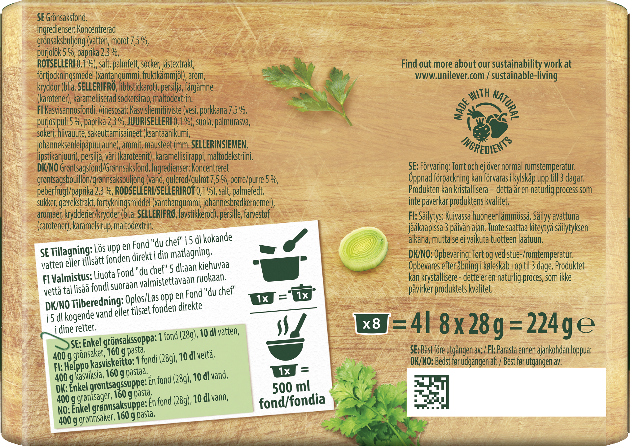 Knorr Fond ”du Chef” on tiivistetty korkealaatuinen annosfondi, joka on valmistettu laadukkaista raaka-aineista. Tee fondista liemi tai lisää se suoraan ruokaan korostamaan ruoan luonnollisia makuja. Kasvisannosfondi on käyttövalmis annos, joten sinun ei tarvitse annostella fondin määrää. Täyteläinen maku hitaasti haudutettuna. Huuhdo ja pilko vihannekset. Lämmitä uuni. Tänä iltana on kasvisruokaa. Apunasi on upea liemi, täyteläinen ja herkullinen Knorr Fond "Du Chef" -kasvisannosfondi. Korkealaatuinen annosfondi liukenee helposti kiehuvaan veteen muodostaen maukkaan liemen. Niin hyvää ja täydellistä – aivan kuin olisit tehnyt sen kokonaan itse. Knorr-fondi ei sisällä lisättyjä aromivahventeita, ei säilöntäaineita eikä keinotekoisia väriaineita. Sen sijaan Knorr-fondit maistuvat aidon liemen tavoin täyteläiseltä. Aito ja herkullinen maku tulee aineksista, jotka ovat kiehuneet yhdessä tuntikausia. Knorr Fond "Du Chef" -kasvisannosfondi taipuu monenlaiseen ruoanlaittoon. Voit käyttää fondia grillattujen vihannesten, perunoiden ja riisin kanssa, tai esimerkiksi kalaruokiin. Tai kokeile Knorr Fond "Du Chef" -kasvisfondia seuraavan kerran, kun teet kotitekoista Hollandaise-kastiketta. Kasvisfondi on liemipohja, joten sinun tarvitsee vain liuottaa fondi kiehuvaan veteen tai lisätä suoraan ruoanlaiton yhteydessä ainesten sekaan. Yksinkertaista ja upeaa vähällä vaivalla. Kahdeksasta Knorr Fond "Du Chefistä” saat neljä litraa fondia. Me rakastamme hyvää ruokaa ja ruoanlaittoa. Olemme tehneet Knorrilla vuosikymmeniä työtä korkealaatuisten ruokatuotteiden puolesta käyttäen parhaita raaka-aineita. Haluamme auttaa sinua valmistamaan hyvää, yksinkertaista ja terveellistä ruokaa, jossa on runsaasti makua. Johtotähtemme on intohimo laadukkaaseen ja maukkaaseen ruokaan. Se vie meidät tulevaisuuteen, joka huomioi paremmin yhteiskuntamme ja ympäristömme. Tulevaisuuteen, jossa kaikki raaka-aineemme vihanneksista alkaen ovat kestävästi tuotettuja.