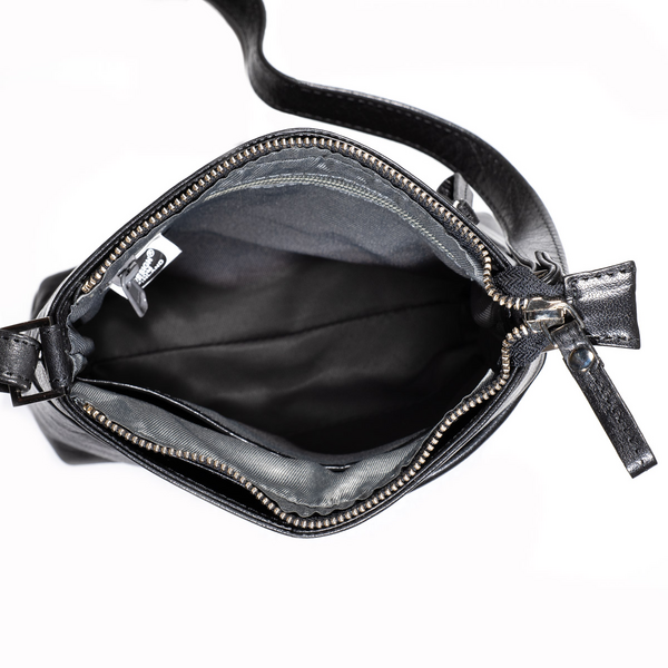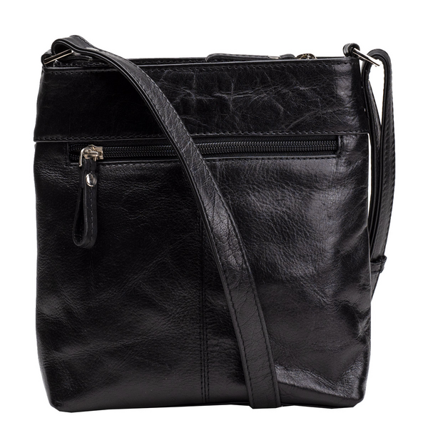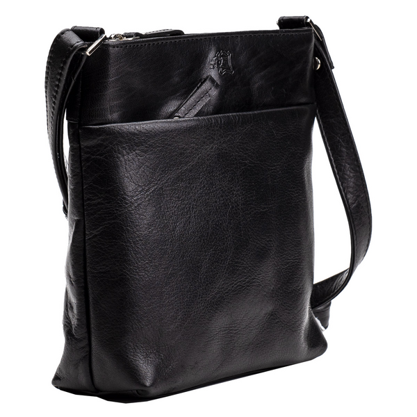 Reipas olkalaukku laadukkaasta nahasta. Suljetaan vetoketjulla ja sisällä pieni vetoketjutasku ja avotasku esim. puhelimelle. Laukun edessä ja takana vetoketjulliset taskut. Pitkä portaattomasti säädettävä olkahihna.