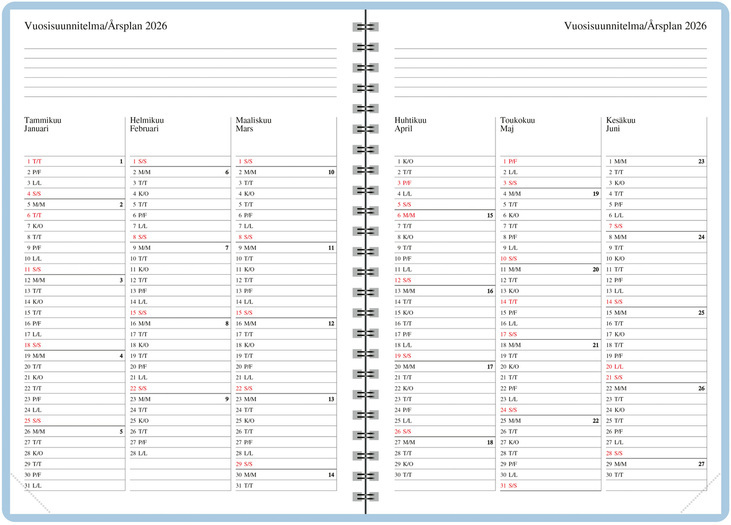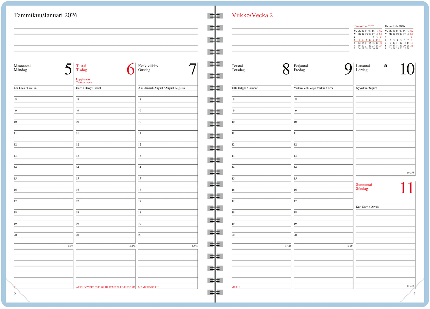 Kokonaisuus hallintaan kolmella kielellä. Koko 148 x 210 mm (A5); parikierresidottu; leatherette-kannet; kielisyys: suomi, ruotsi, englanti; 2026 yleiskalendaario; päiväkirja 52/2025–53/2026; vuosisuunnitelmat 2026 ja 2027; kansalliset vapaapäivät; suomalaiset ja suomenruotsalaiset nimipäivät; auringon nousu- ja laskuajat (Helsinki, Oulu); kansainvälinen aika; runsaasti muistiinpanotilaa; kynänpidike; painettu Suomessa; FSC®-sertifioitu tuote.