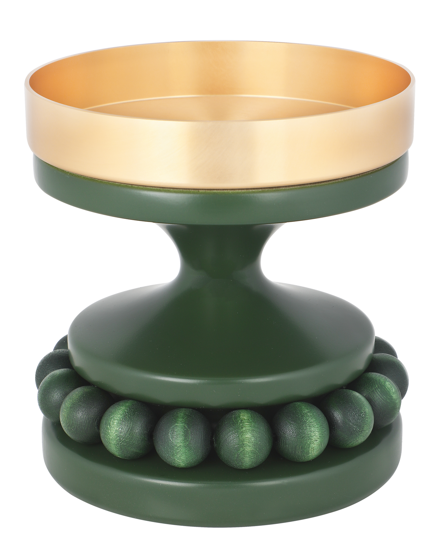 Ruustinna-kynttilänjalka on puusta sorvattu ja siinä on yksi helmikranssi sekä kullanvärinen metallinen alusta kynttilälle.