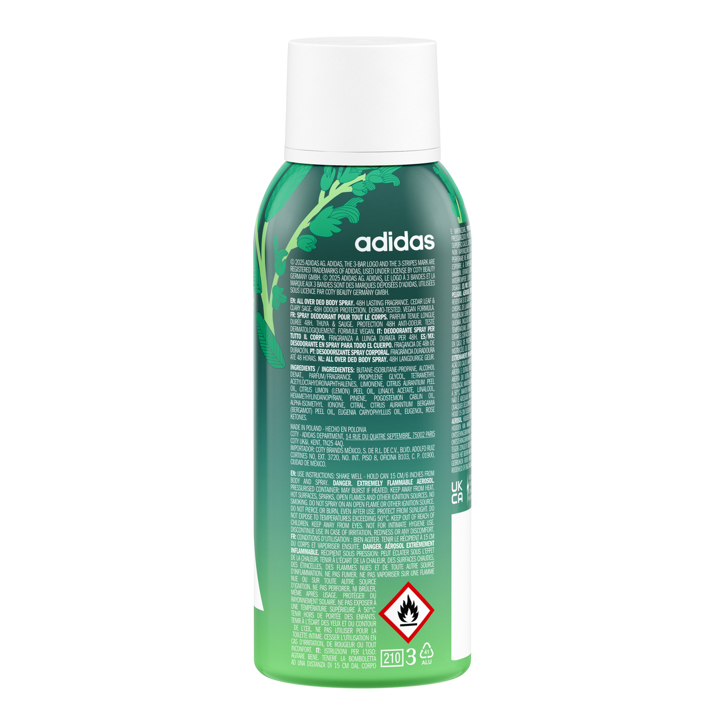 """Tunne itsesi virkistyneeksi uusien adidas Vibes All Over Deo Body Sprays -vartalosuihkeiden avulla. Vibes Full Recharge All Over Deo Body Spray -vartalosuihke on kehitetty tuoksuilla, joiden on todistettu saavan sinut tuntemaan olosi positiiviseksi*. Tuoksussa on on setripuunlehden ja neilikkasalvian nuotteja ja se antaa 48h suojan hajuja vastaan. Dermatologisesti testattu ja sopii myös herkälle iholle. *115 osallistujan kuluttajatestissä 81 % oli tätä mieltä"""