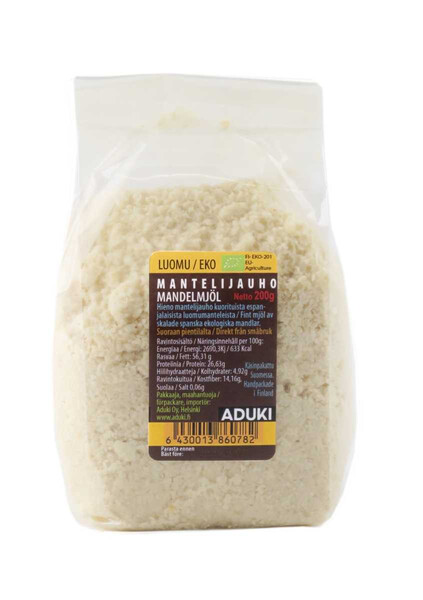Espanjalaisista luomumanteleista jauhettu. Mantelijauho on gluteeniton, proteiinipitoinen ja sisältää vähän hiilihydraatteja. Miedon makunsa ansiosta mantelijauho sopii hvyin leivontaan. Käytä myös jogurtissa, puurossa, smoothieissa tai myslissä.
