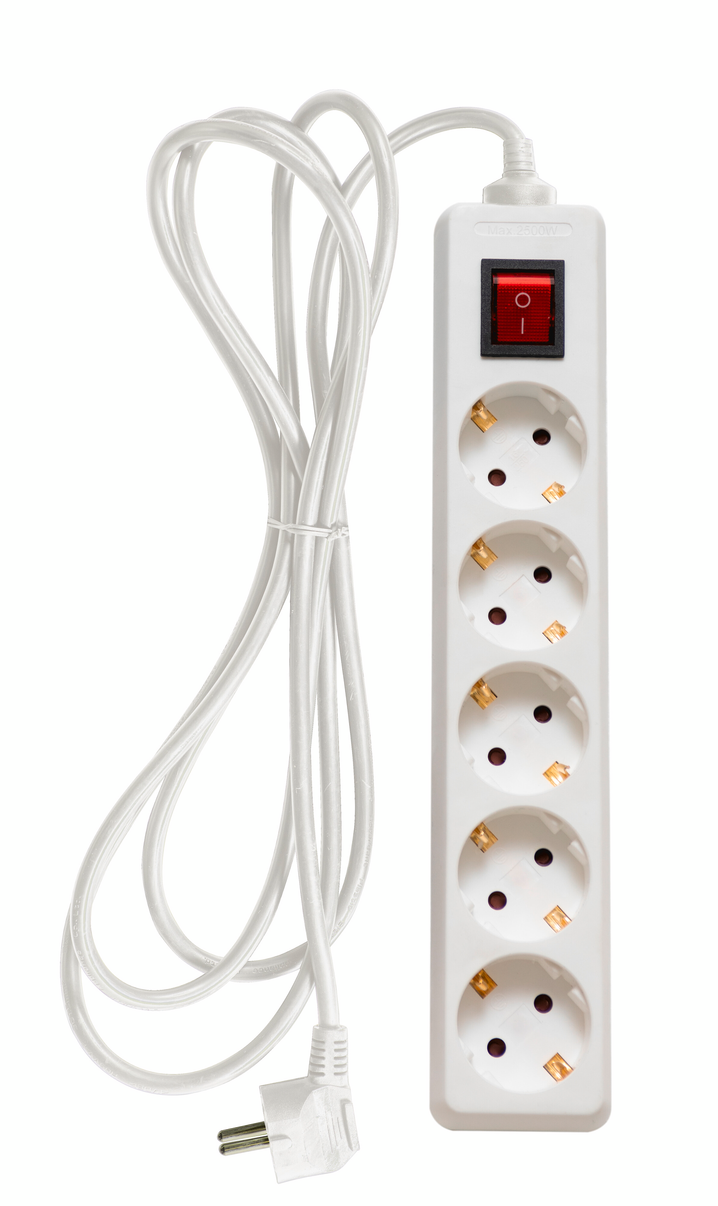 On/off-kytkimellä varustettu 5-osainen jatkojohto sisäkäyttöön. Pistotulppa ja runko-osa valkoiset. Kotelointiluokka IP20. Johdon pituus 2 m. H05VV-F 3 x 1,5 mm².