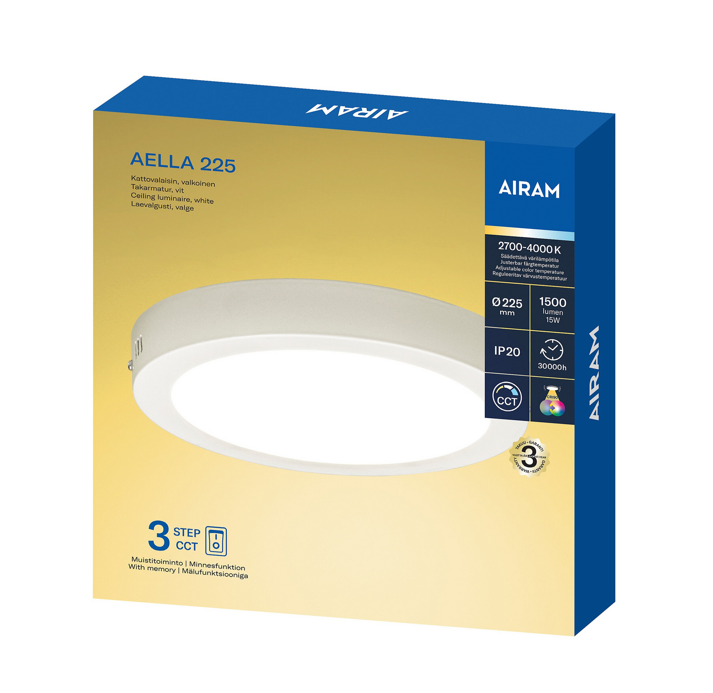 Plafondi tehokkaaseen yleisvalaistukseen. Valaisimen voi pinta-asentaa kodin kuiviin sisätiloihin, IP20. Erinomainen värintoisto, CRI90. Valon sävyä voi vaihtaa portaittain tavallisesta valokatkaisimesta! Värilämpötilaa vaihdetaan napsauttamalla valokytkintä uudelleen 3 sekunnin sisällä valon syttymisestä. Valon värilämpötilavaihtoehdot: lämmin valkoinen 2700 K, valkoinen 3000 K, viileän valkoinen 4000 K. Valaisimessa on muistitoiminto: kun valaisimen sammuttaa kokonaan, siinä säilyy viimeisin valoasetus.