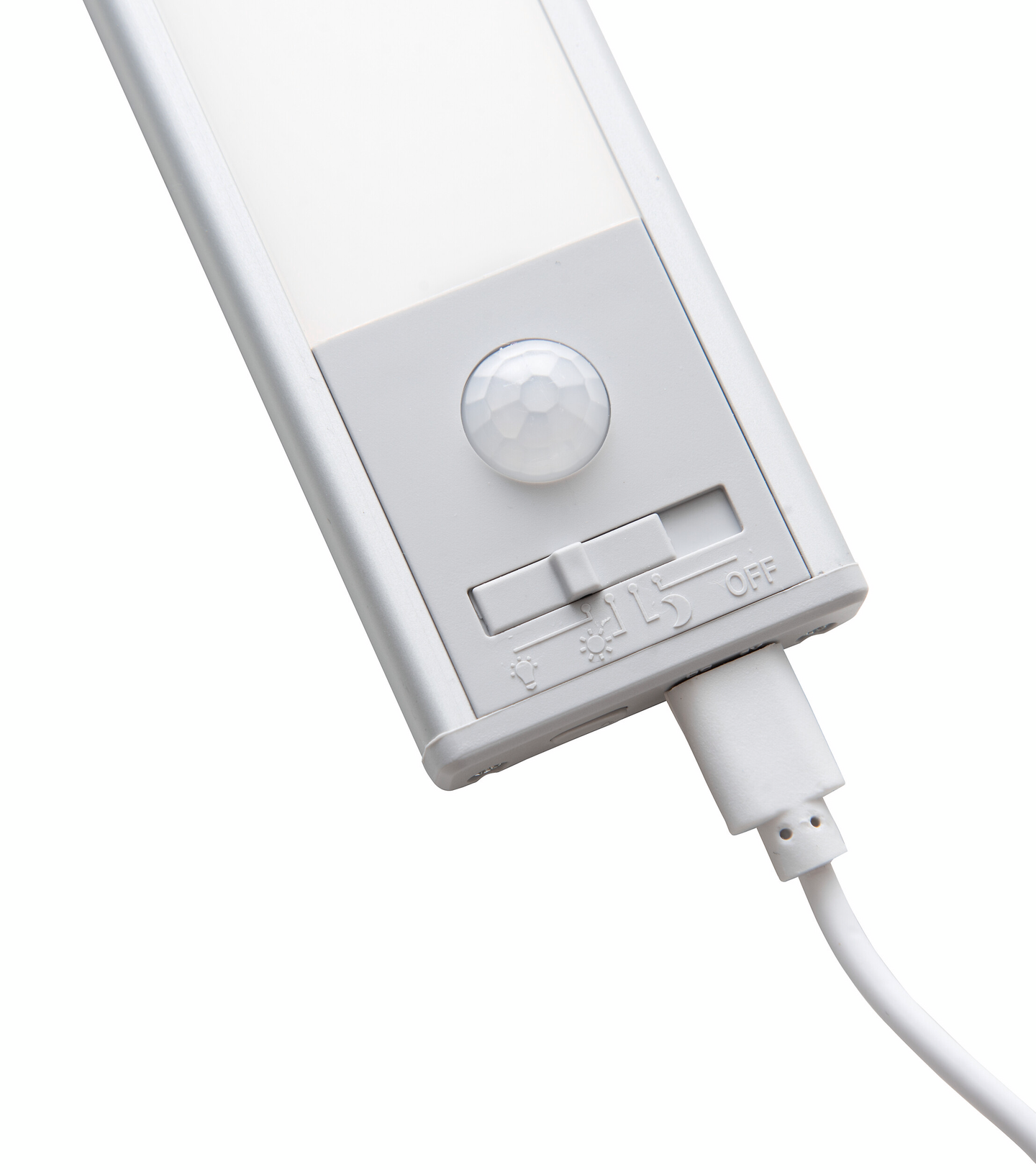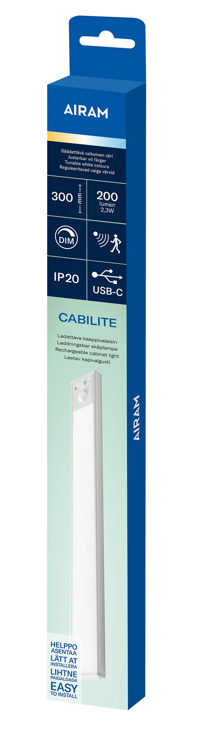 Ladattava CabiLite led-valo monipuolisilla toiminnoilla: liiketunnistin, valon kirkkauden säätö sekä erilliset yö- ja päiväasetukset. Helppo kiinnittää esim. seinään tai hyllytasolle - missä ikinä näppärälle liiketunnistinvalolle onkaan tarvetta! Sisäkäyttöön kodin kuiviin sisätiloihin. Led kiinteä 3CCT 2700 K – 4000 K – 6500 K, ei vaihdettava, 30 cm: 1500 mAH 200 lm 2,3 W. Portaaton himmennystoiminto (0 % - 100 %). Kevyt ja matalarunkoinen, koko: leveys 39 mm, korkeus 10 mm, pituus 30 cm. USB-C latausportti. Mukana latausjohto USB-A/USB-C, pituus 40 cm.