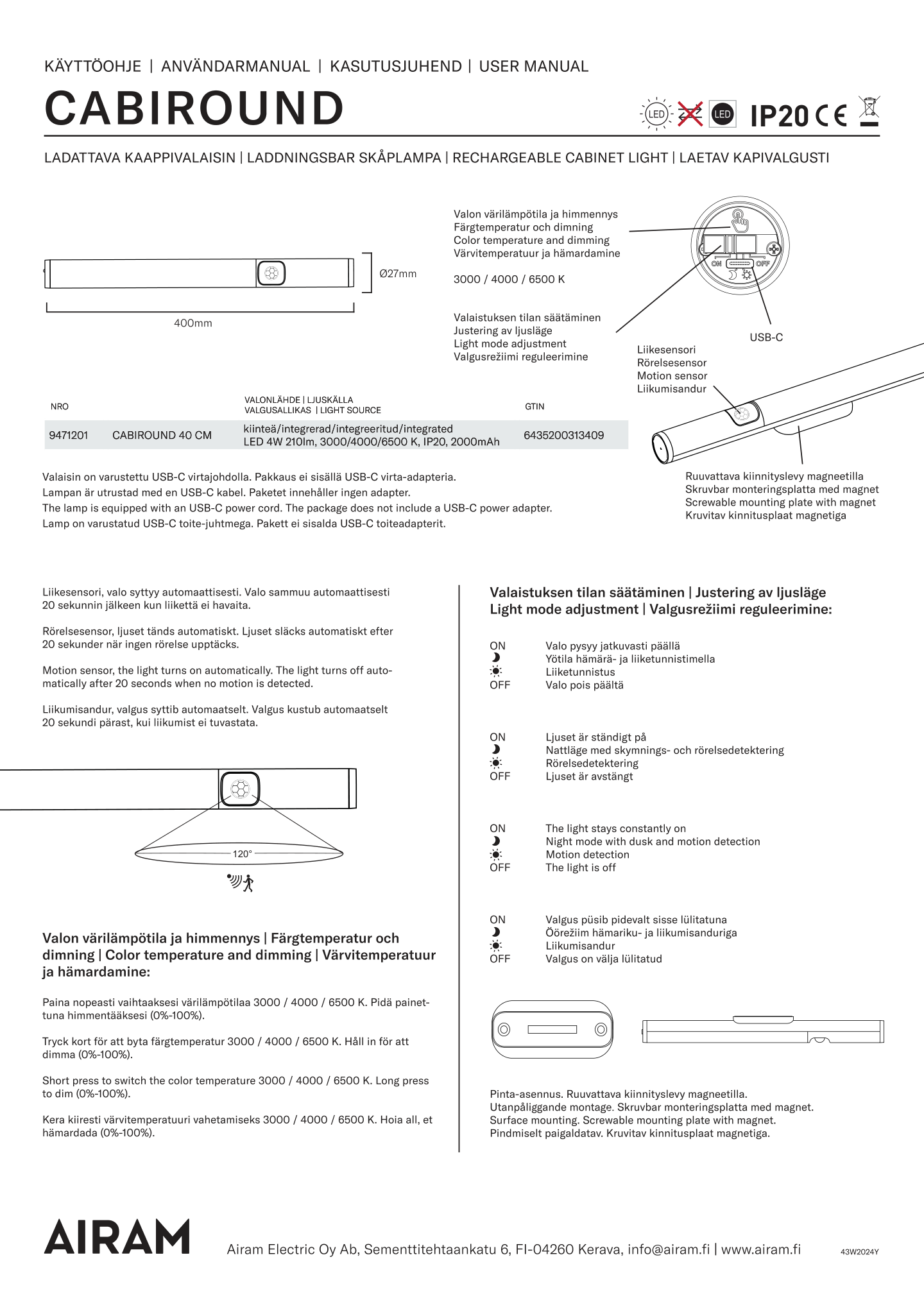Sylinterin muotoinen ladattava CabiRound led-valo monipuolisilla toiminnoilla: liiketunnistin, valon kirkkauden säätö sekä erilliset yö- ja päiväasetukset. Helppo kiinnittää esim. seinään tai hyllytasolle - missä ikinä näppärälle liiketunnistinvalolle onkaan tarvetta! Valon voi helposti irrottaa magneettisesta kiinnityslevystä. Sisäkäyttöön kodin kuiviin sisätiloihin. Led kiinteä 3CCT 2700 K – 4000 K – 6500 K, ei vaihdettava, 2200 mAH 210 lm 4 W. Portaaton himmennystoiminto (0 % - 100 %). Koko: Ø 26 mm, pituus 40 cm. USB-C latausportti. Mukana latausjohto USB-A/USB-C, pituus 40 cm.