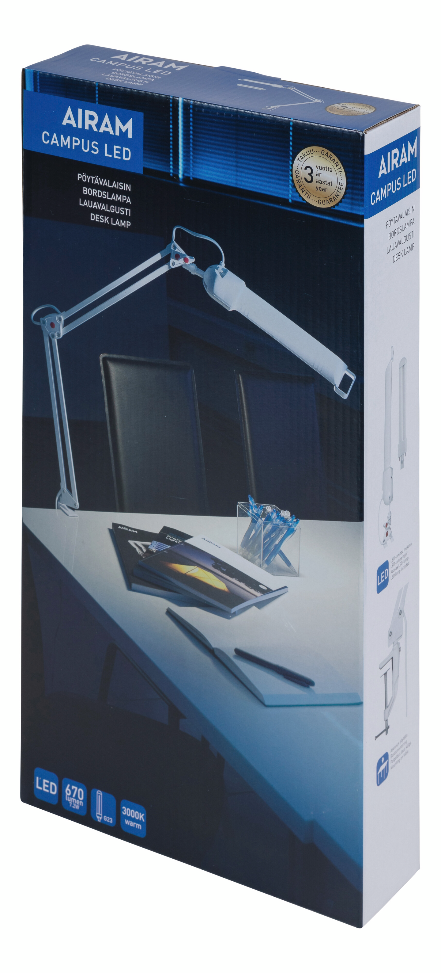 Klassinen nivelletty työpöytävalaisin. Runko metallia/muovia, valkoinen. Vaihdettava led-pistokantalamppu (G23 7,2 W 670 lm 3000 K) sisältyy. Ruuvattava jalkatuki. Pistotulppaliitäntä, johto valkoinen 1,85 m. On/off-kytkin.