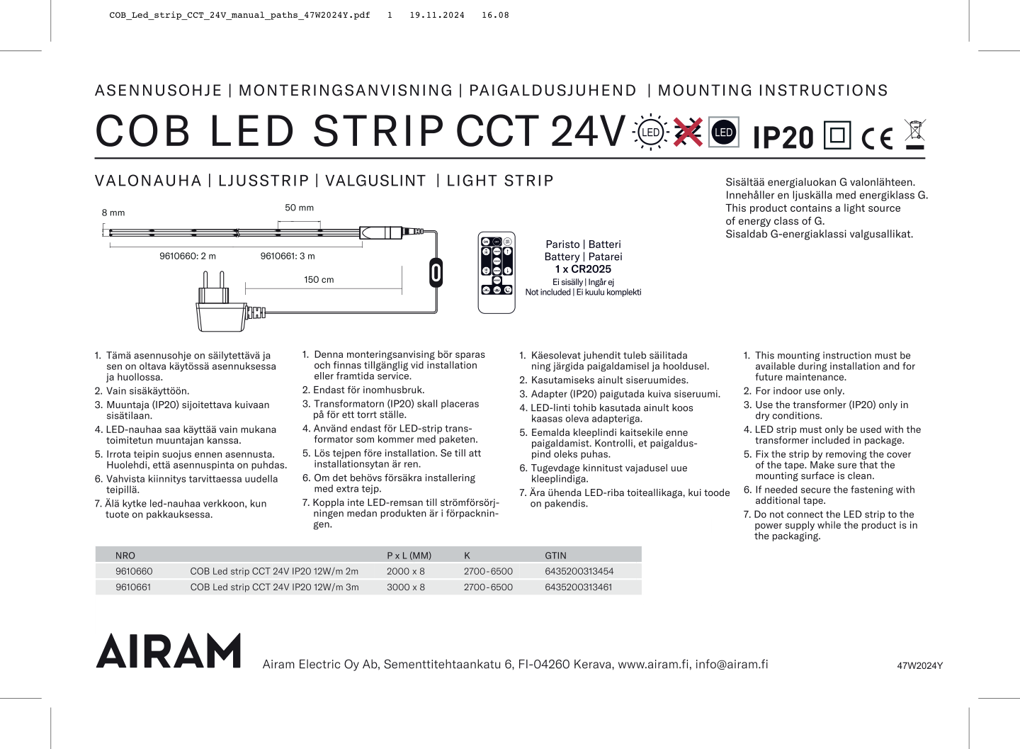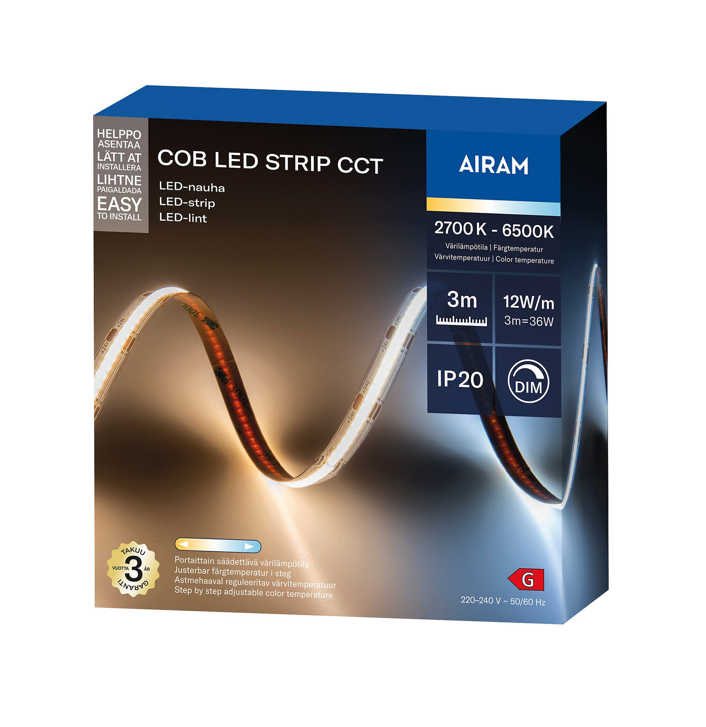 Led-nauha, jossa valon värisävyä voi säätää kolmiportaisesti, pituus 3 m. Led kiinteä 3CCT 3000 K – 4500 K – 6500 K, RA90, 576 led/m, 900 lm/m. 12 W. Portaaton himmennystoiminto. DC 24 V. Välikytkin johdossa, johdon pituus 1,5 m. Mukana kaukosäädin. Sisäkäyttöön, kodin kuiviin sisätiloihin.