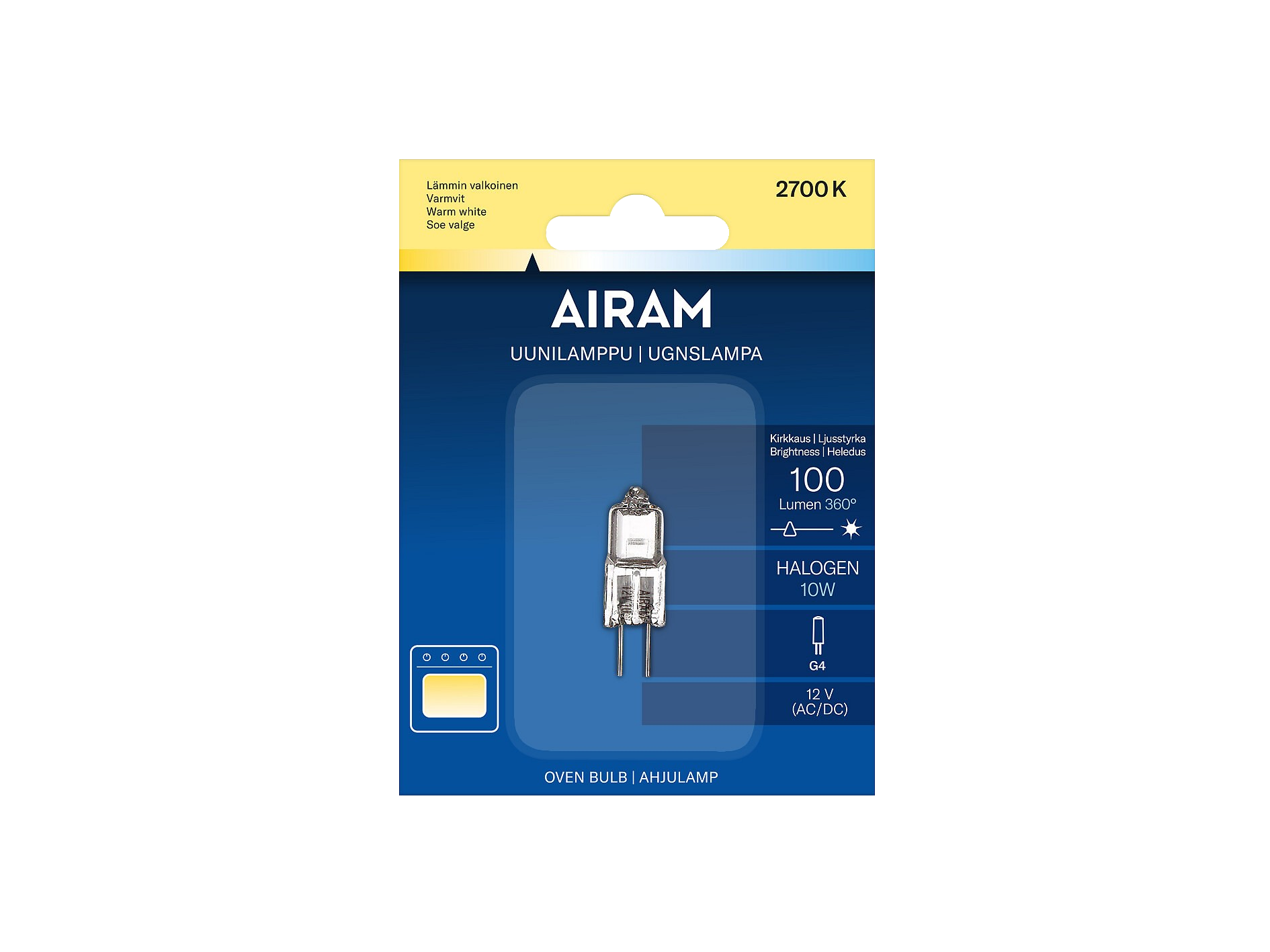 Uunilamppu halogeeni 10W 100lm G4-kanta. Polttoikä n. 1000 h.