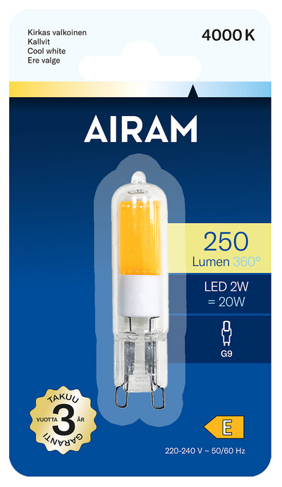 Kirkas polttimokupuinen led-lamppu 2W 4000K G9 250lm 15000h 14x60 mm.