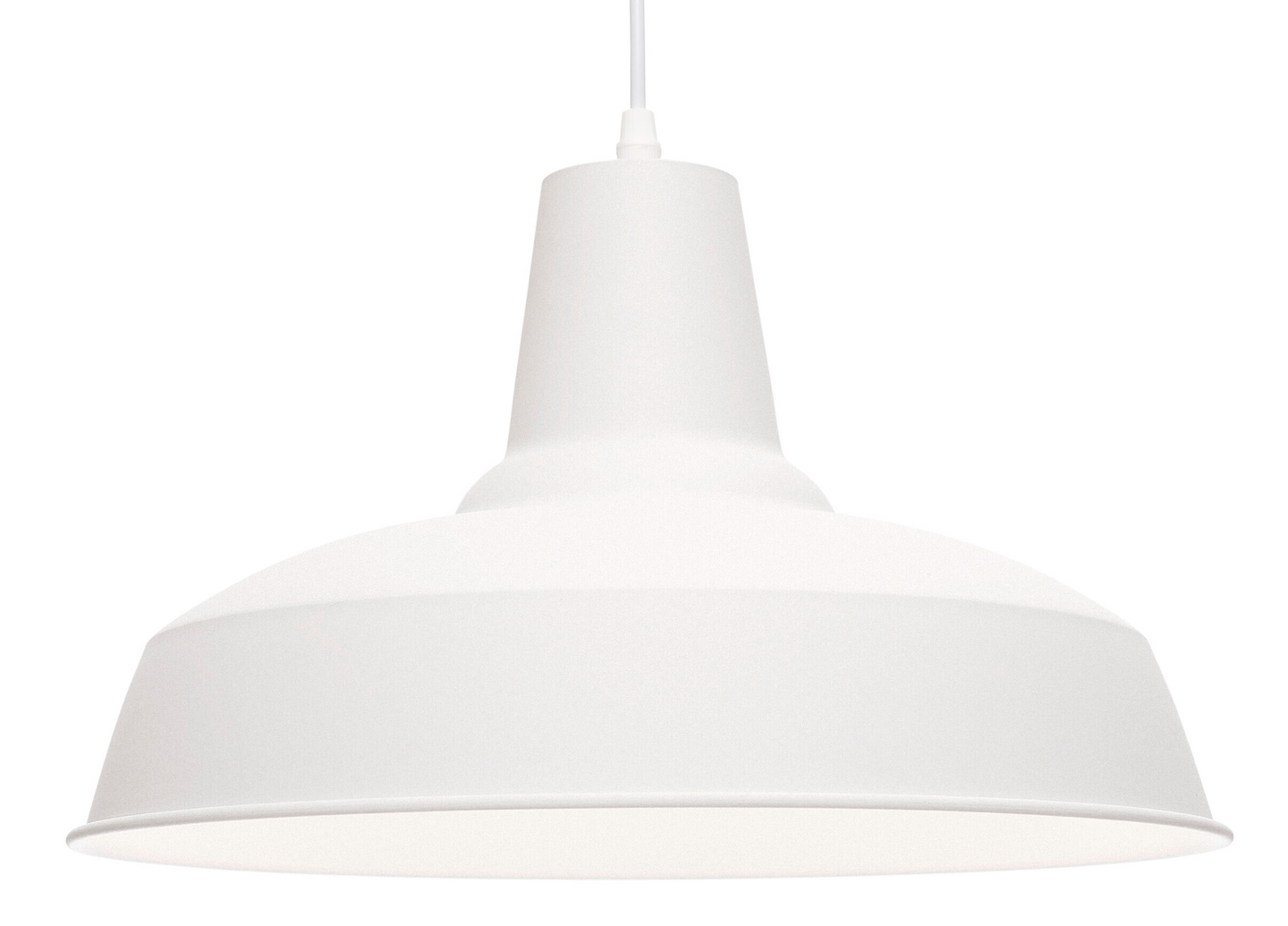 Varjostimen ja kattokupin himmeä metallipinta on maalarinvalkoinen ja sisäpuoli valkoinen. 1,5 m pitkässä, tekstiilipintaisessa kangasjohdossa on valmiina valaisinpistotulppa.