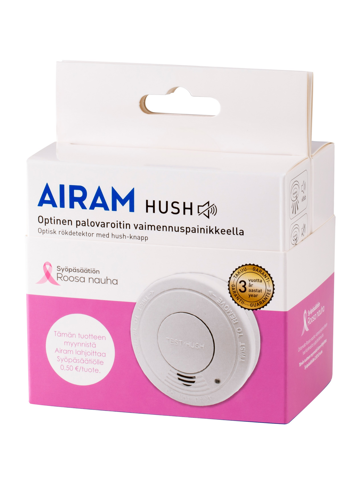 Hush optinen palovaroitin äänenvaimennuspainikkeella. Voit hiljentää varoittimen painamalla Hush-äänenvaimennuspainikkeesta. Vaimennus kestää yhdellä painalluksella n. 10 min, jonka jälkeen hälytin palaa automaattisesti takaisin aktiivitilaan. Paristo 9V mukana pakkauksessa. Käyttöikä 8 vuotta. Ei sisällä radioaktiivisia aineita. EN 14604-hyväksyntä. Halkaisija 101 mm. Vain sisäkäyttöön. Pakkauksessa 2 kpl. Airam Roosa nauha tuote - Airam lahjoittaa jokaisesta myydystä roosa nauha tuotteesta osan Syöpäsäätiölle.