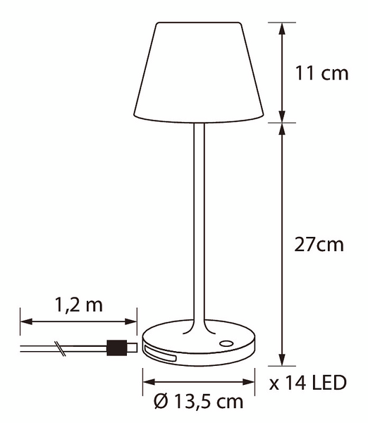 Tyylikäs 38 cm korkuinen led-pöytävalo, jonka umpinainen kupu kajastaa pehmeästi valkoista valoa. Varjostimen halkaisija on 15 cm. Musta metallijalka, valkoinen umpikupu.