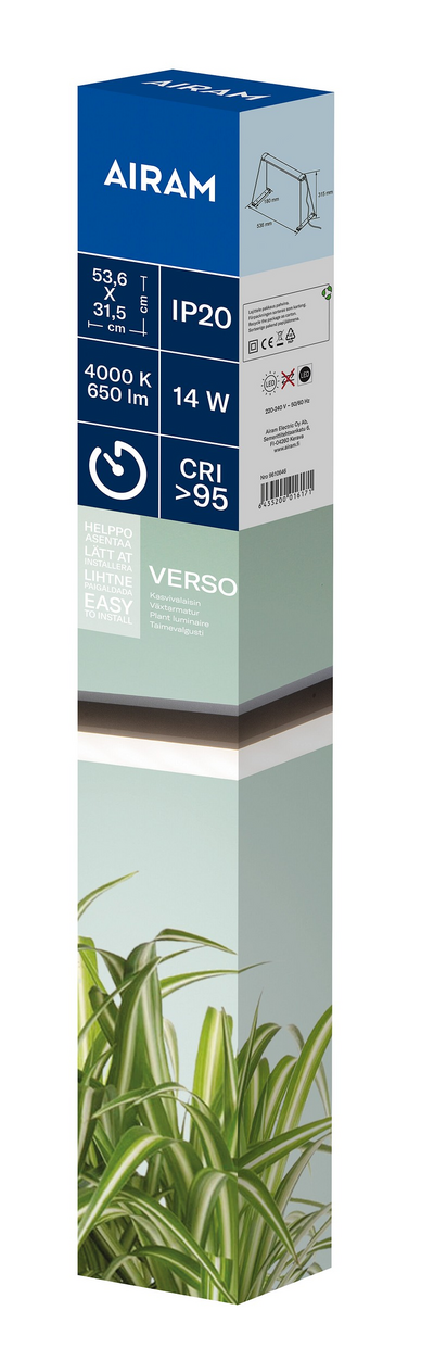 Ihanteellinen led-kasvivalo idättämiseen tai pienille yrteille. Osat erillisinä pienessä pakkauksessa. Helppo koota: yhdistä metallijalat valopalkin molempiin päihin sekä jalkatukiin, jolloin valo seisoo tukevasti tasolla. Aseta kasvit valon alle. Tuotteessa on sisäänrakennettu ajastin. Valo palaa 16 tuntia ja on pois päältä 8 tuntia. Led-valo ei kuumenna kasveja ja kuluttaa vain vähän energiaa. Sisäkäyttöön, ei huonevalaistukseen. IP20 Led kiinteä 4000 K 650 lm 14 W CRI95 Käyttöikä 25 000 h. Käyttölämpötila -20 °C … +40 °C. 220-240 V ~ 50/60 Hz Koko: leveys 53,6 cm, korkeus 31,5 cm, syvyys 18 cm. Johto musta, 1,5 m. Ohjain johdossa.