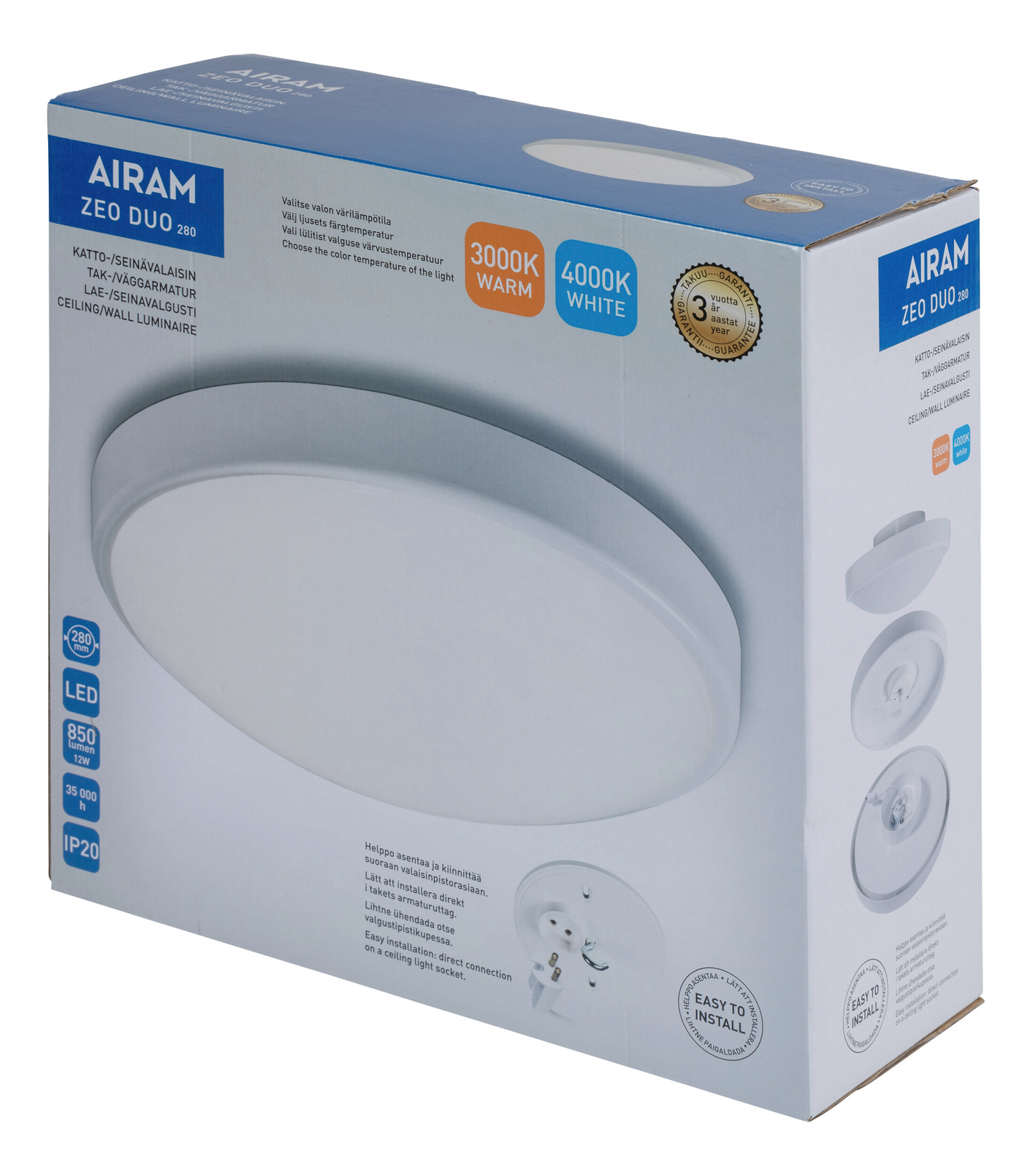 Yleisvalaisin kodin kuiviin sisätiloihin. IP20. Helppo asennus katon valaisinpistorasiaan valaisinpistotulpalla ja kiinnityskoukulla, asennustarvikkeet sisältyvät. Ø 280 mm. Valitse valon värilämpötila ennen asennusta: valkoinen 3000K tai viileän valkoinen 4000K. Valo on tasainen ja syttyy heti. Kestävä polykarbonaattirunko, kupu opaalimuovia, väri valkoinen. IK10. Kiinteä AC led 12 W 850 lm.
