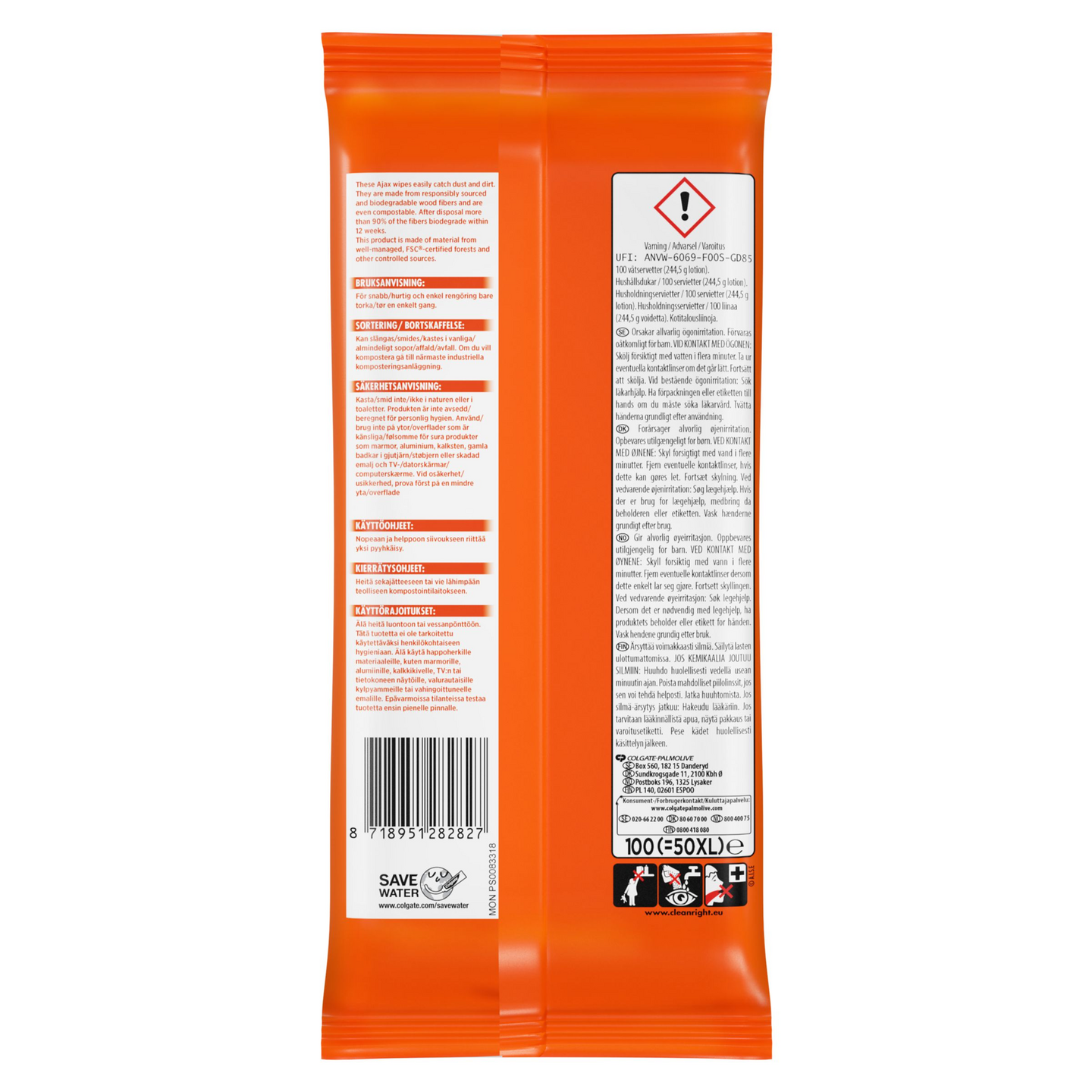 Siivoaminen on helppoa Ajax Universal -puhdistusliinoilla! Ne puhdistavat helposti pölyn ja lian kodin pinnoilta. Liinat jättävät jälkeensä miellyttävän sitruksisen mintun tuoksun pinnoille, ja tekevät siivouksesta helppoa ja kätevää. Pakkaus sisältää 100 kpl liinoja.