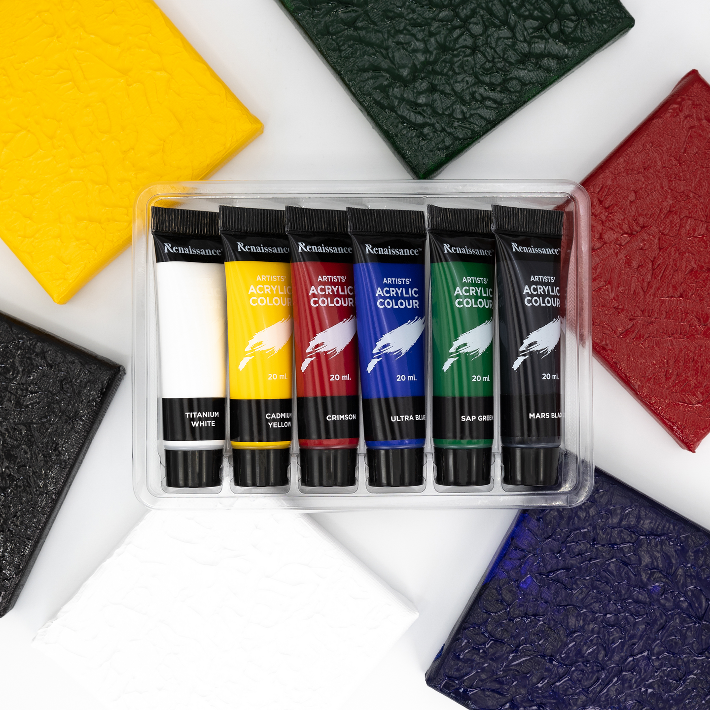 Renaissance akryylimaalit ovat myrkyttömiä ja CE-merkittyjä. Maalit levittyvät helposti ja pigmentti on erittäin peittävää. Maalit ovat vesiohenteisia eli niitä voi halutessaan ohentaa vedellä. Maalit tulevat kätevissä 20 ml tuubeissa. Pese työvälineet sekä kädet lämpimällä vedellä ja saippualla. Akryylimaalit soveltuvat paperille, pahville, maalauspohjille, puulle, kankaalle, metallille, keramiikalle ja joillekin muoveille. Akryylimaalisetti sisältää 6 eri sävyistä akryyliväriä. Värit sekoittuvat hyvin keskenään, joten saat varmasti luotua tarvitsemasi sävyt. Paketin sävyt ovat: Titanium White, Cadmium Yellow, Crimson, Ultra Blue, Sap Green ja Mars Black.