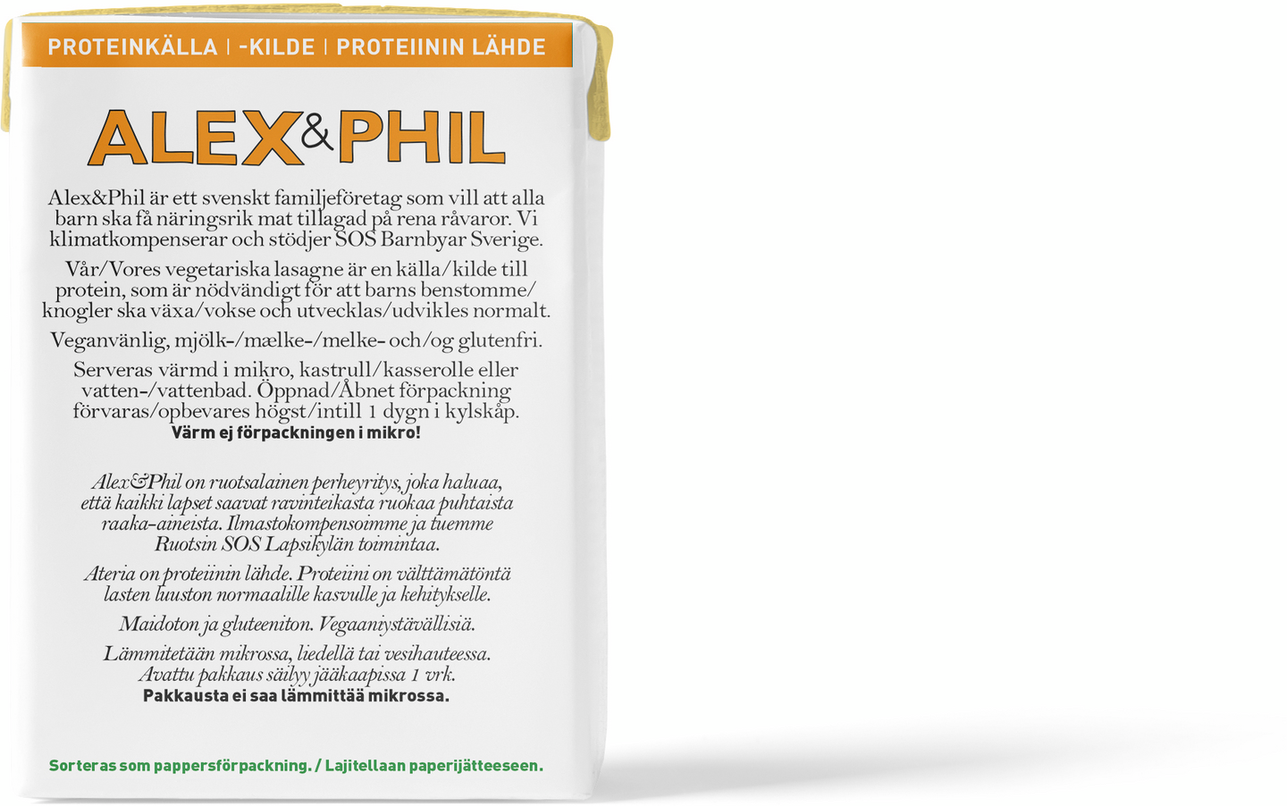 Alex&Phil on ruotsalainen perheyritys, joka haluaa, että kaikki lapset saavat ravinteikasta ruokaa puhtaista raaka-aineista. Ilmastokompensoimme ja tuemme Ruotsin SOS Lapsikylän toimintaa.