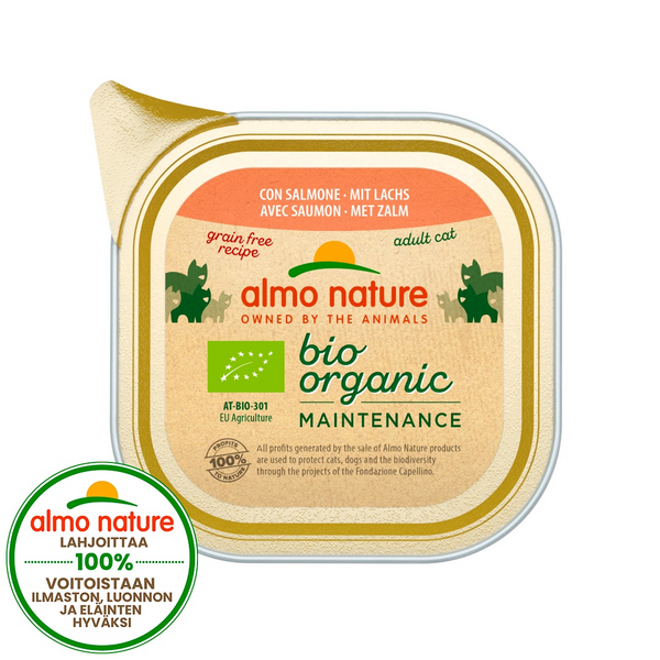Täysravinto kaikenikäisille kissoille - erittäin maistuva märkäruoka kaikille kissoille - 100 % luomua: sertifioidusta, luonnonmukaisesta maataloudesta -laadukkaat luomuainesosat - gluteeniton ja viljaton - ei sisällä torjunta-aineita tai kemiallisia jäämiä - ei geneettisesti muunnettuja aineosia - tasapainoinen: vitamiineja ja kivennäisiä - ei sisällä keinotekoisia säilöntä- ja väriaineita, arominvahventeita tai ruokahalua edistäviä aineita - herkullista ja hyvin sulavaa Almo Nature oli markkinoiden ensimmäinen täysin luonnollinen lemmikkieläinten ruoka. Laadukkaat raaka-aineet on huolella valittu ja hellävaraisesti valmistettu. Vuodesta 2018 alkaen 100% Almo Naturen voitoista on lahjoitettu luonnon hyväksi. Bio Organic on ainutlaatuinen märkäruoka kaikille kissoille. Sen kaikki laadukkaat ja luonnolliset raaka-aineet ovat peräisin sertifioiduilta luomutiloilta. Käytetyt ainesosat takaavat, että siinä ei ole kasvimyrkkyjä tai kemiallisia jäämiä, eikä myöskään käytetty geeniteknologiaa. Valmistettu ilman keinotekoisia väri- tai säilöntäaineita. Ravinto on hyvin sulavaa ja sopii erinomaisesti myös allergisille ja herkille kissoille. Korkea eläinproteiinipitoisuus takaa herkullisen maun ja erinomaisen maittavuuden. Kokonaisvaltainen ravinto on rikastettu vitamiineilla ja kivennäisaineilla, jotta se on ravintoainepitoisuudeltaan tasapainossa. Ravintoon on lisätty myös kissoille välttämätöntä tauriinia, jota kissan oma elimistö ei kykene muodostamaan riittävästi. Tauriini ylläpitää näkökykyä ja sydämen toimintaa, sekä auttaa pitämään ihon terveenä ja turkin kiiltävänä. Tärkeät vitamiinit ja herkullinen maku viimeistelevät aterian ja antavat kissallesi kaiken, mitä se tarvitsee terveeseen ja aktiiviseen elämään.