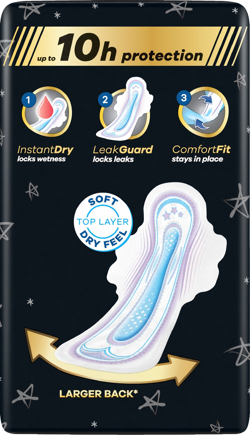 Erityisesti yökäyttöön kehitetty Always Ultra Secure Night -side, koko 4, antaa lisäsuojaa yön aikana 60 % leveämmän takaosan ansiosta (verrattuna Always Ultra Normal -siteeseen). Se suojaa entistä paremmin ohivuodoilta riippumatta siitä, kuinka paljon hyörit ja pyörit yön aikana. Always Ultra -siteessä on siteen hyvin paikallaan pitävä Flex & Fit -järjestelmä ja vuotamaton nestettä lukitseva geeli, joka imee nesteen ja auttaa siten estämään ohivuodot. Always Ultra Night -side on erittäin mukavan tuntuinen ja suojaa jopa 8 tuntia, vaikka se on vain 3 mm paksuinen. Always Ultra Secure Night, koko 4 – Always Ultran parhaiten yöllä suojaava side.