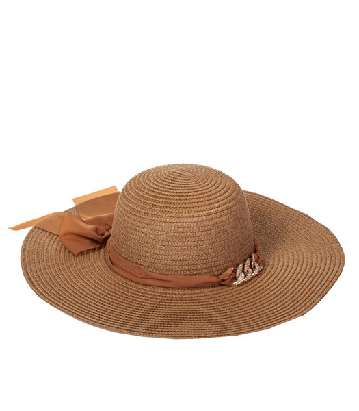Upea iso ruskea hattu jossa koristenauha ja rusetti sekä strassikoristeinen solki. Hatun halkaisija 42cm.